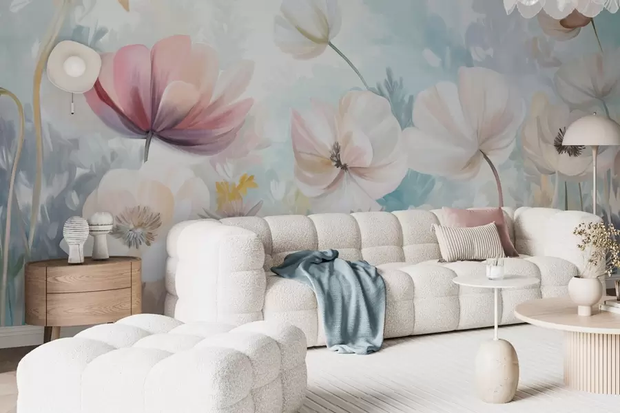Pole kwiatów w pastelowych kolorach o delikatnych płatkach i miękkich zielonych liściach, namalowane w marzycielskim stylu akwareli z fakturą