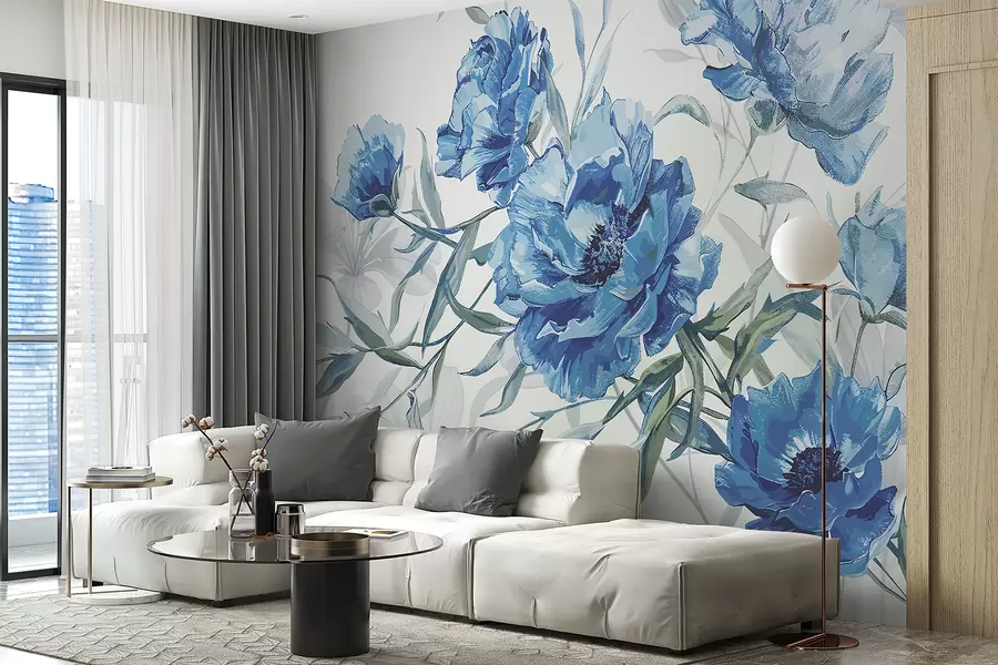 Abstrakcyjne białe maki na niebieskim tle, imitacja pociągnięć pędzla