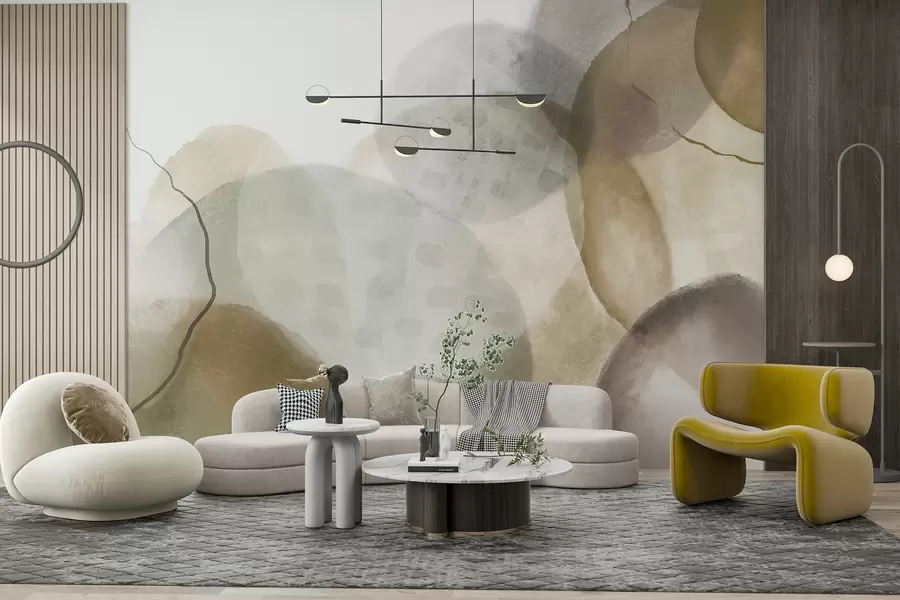 Nowoczesny geometryczny wzór tapety z nakładającymi się kształtami w delikatnych odcieniach beżu, oliwki i taupe.