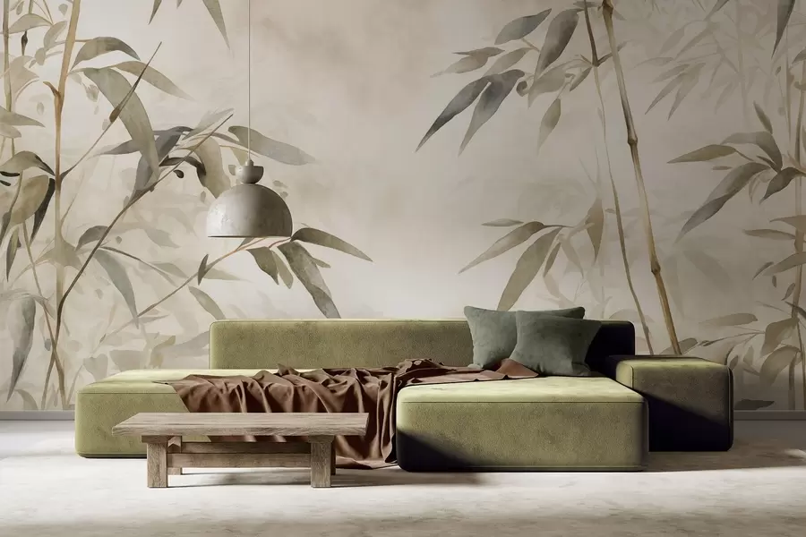 Bambusowe teksturowane gałęzie z liśćmi w stylu akwareli, miękka neutralna paleta kolorów, jasnobeżowe tło