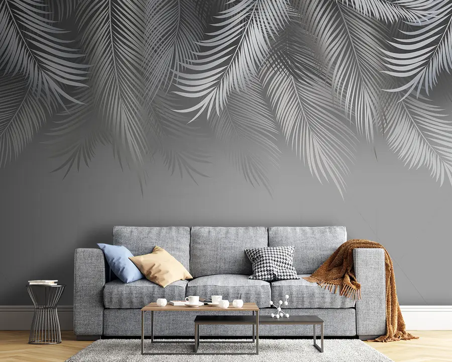 Abstrakcyjne, szczegółowe liście w odcieniach błękitu, szarości i pastelowego różu na jasnym tle