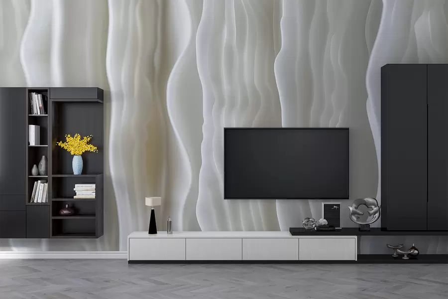Abstrakcyjna kompozycja gładkich, falistych tekstur przypominających marmur w jasnych odcieniach bieli i szarości