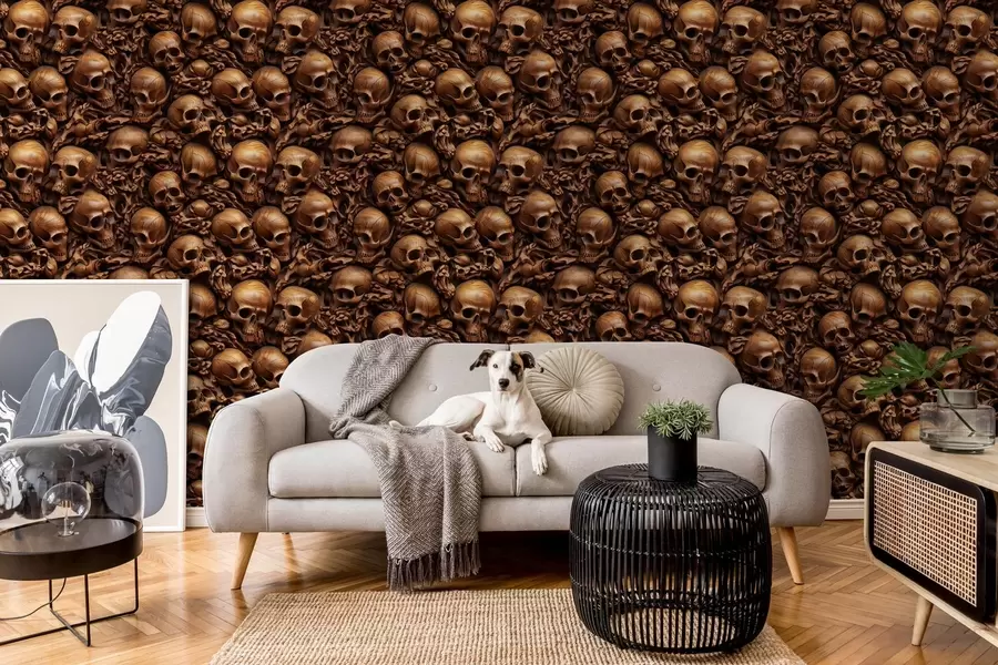 Tapeta z imitacją trójwymiarowych czaszek wyrzeźbionych w drewnie