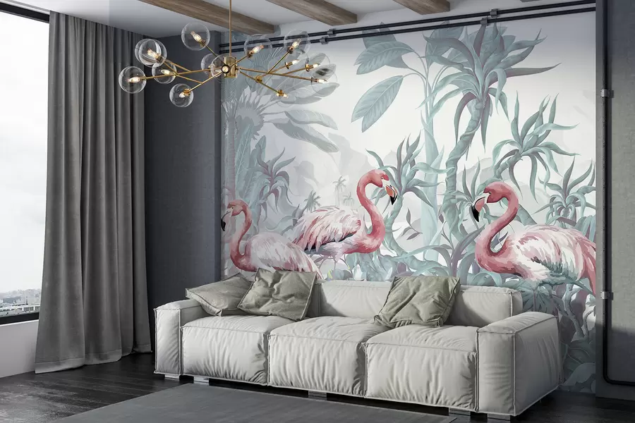 Różowe flamingi stojące w bujnej, tropikalnej roślinności z dużymi liśćmi palmowymi i kwiatami w odcieniach zieleni i bieli
