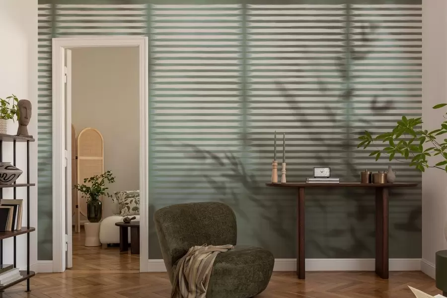 Tropikalne zielone liście palmy na białym tle w paski, miękkie oświetlenie, delikatne pociągnięcia pędzla, organiczne formy