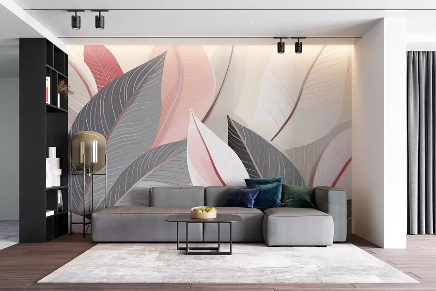 duże tropikalne liście imitujące płaskorzeźbę i panele w jasnych kolorach
