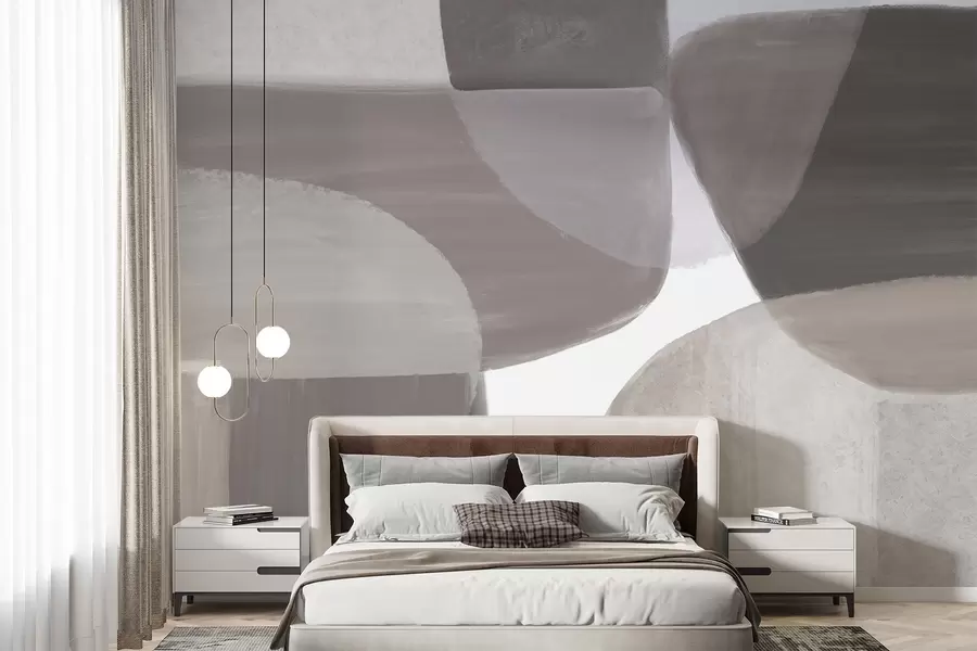 Monochromatyczny abstrakcyjny nadruk z nakładającymi się minimalistycznymi kształtami i formami w odcieniach szarości i beżu