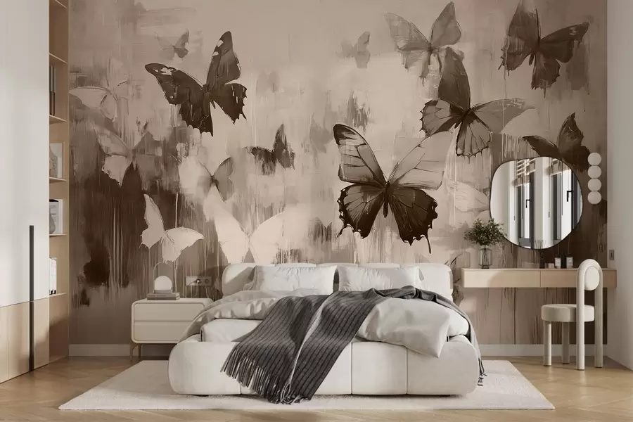 Boho Monochromatyczne Kwiaty i Motyle w beżowym kolorze