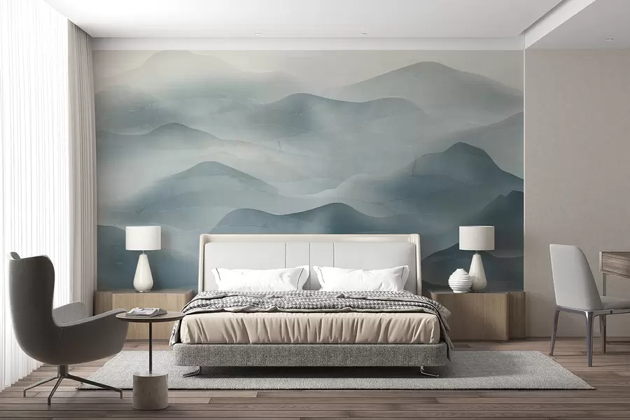 Górski krajobraz z pagórkami i mgłą tworzący spokojną i klimatyczną scenę