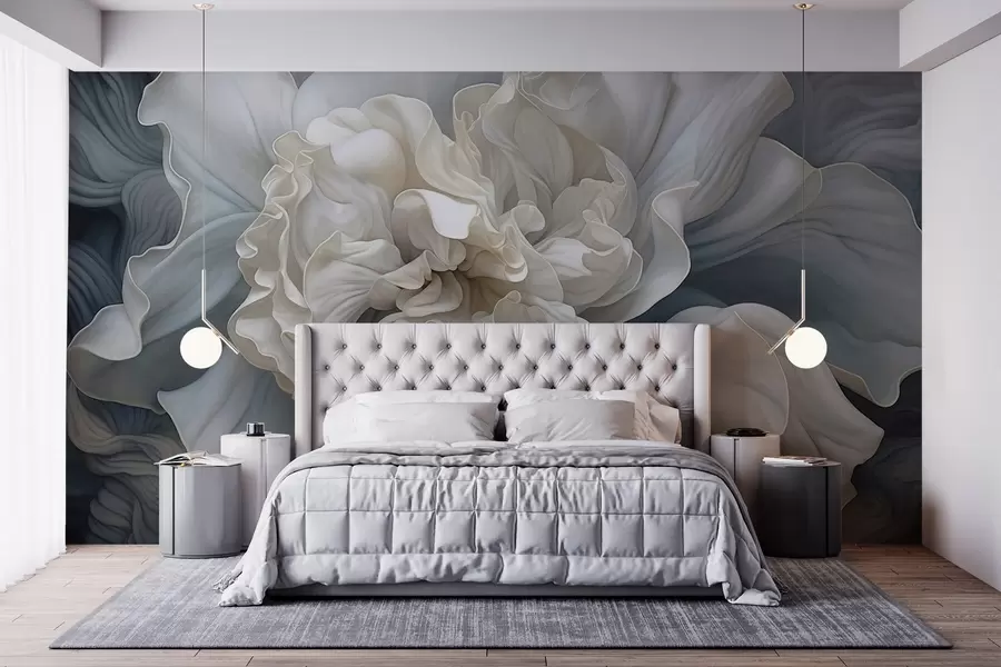 Abstrakcyjny duży dekoracyjny kwiat z wieloma płatkami, miękki i delikatny, z niebieskimi i szarymi odcieniami w tle