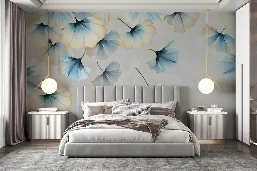 Pastelowe niebieskie i żółte liście miłorzębu z delikatnymi płatkami unoszącymi się w powietrzu na teksturowanym tle