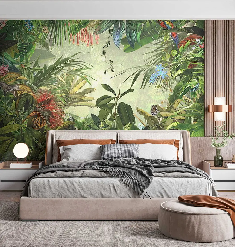 Tropikalne liście z różnymi dużymi zielonymi liśćmi, w tym liśćmi bananowca, liśćmi palmowymi i innymi egzotycznymi gatunkami roślin