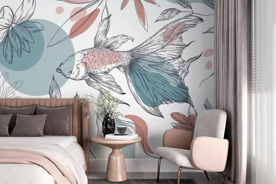 Rysunek ryby z kwiatami, minimalizm, morski, kwiatowy, niebieski i różowy