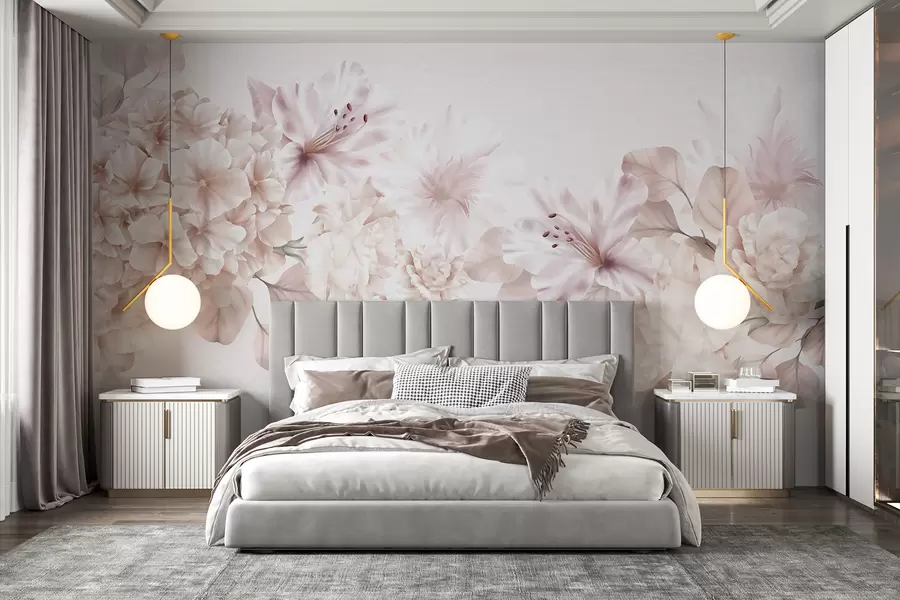Delikatna różowo-biała kompozycja kwiatowa z delikatnymi płatkami i kwiatami na jasnym tle