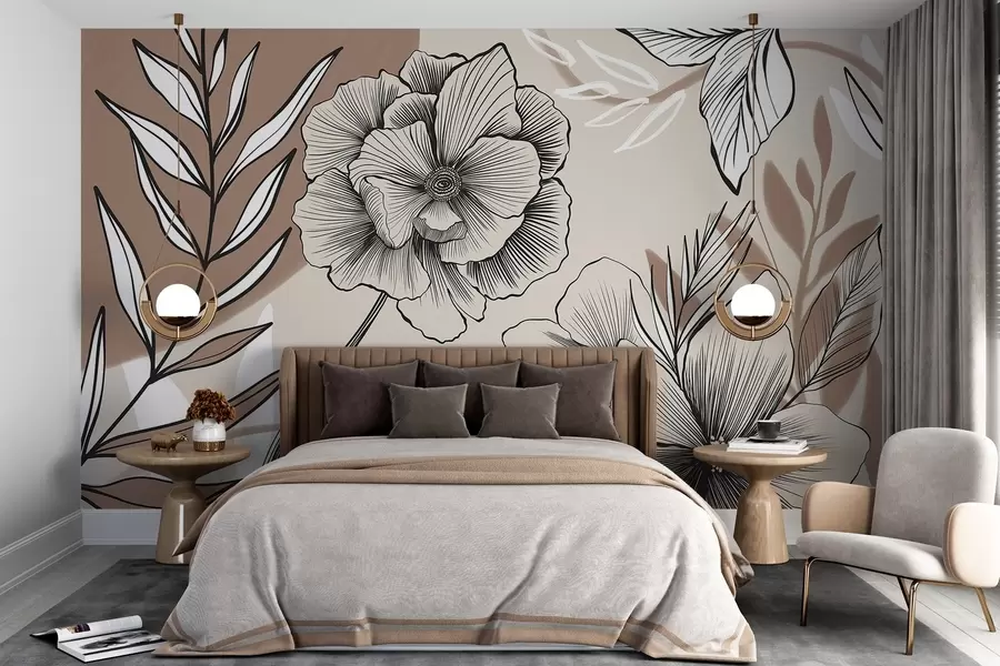 Duże czarno-białe graficzne kwiaty ze szczegółowymi liśćmi na beżowym abstrakcyjnym tle