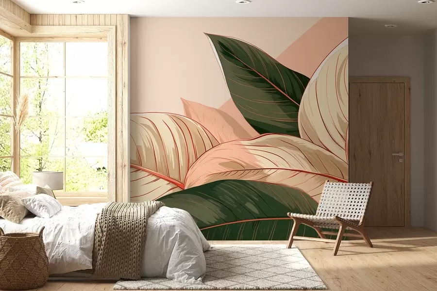 Zielono-beżowe duże tropikalne liście z różowym fragmentem