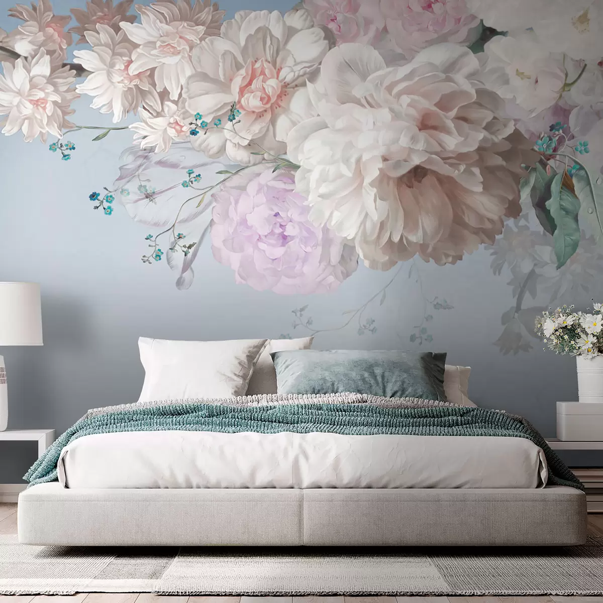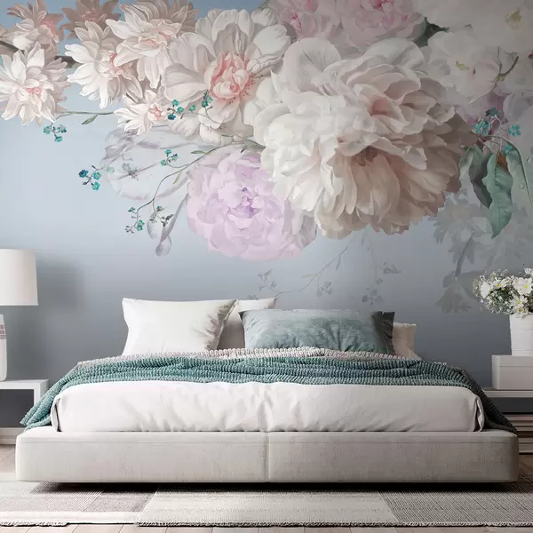 Fototapeta Duże bujne kwiaty, białe piwonie na niebieskim tle Nr u95437