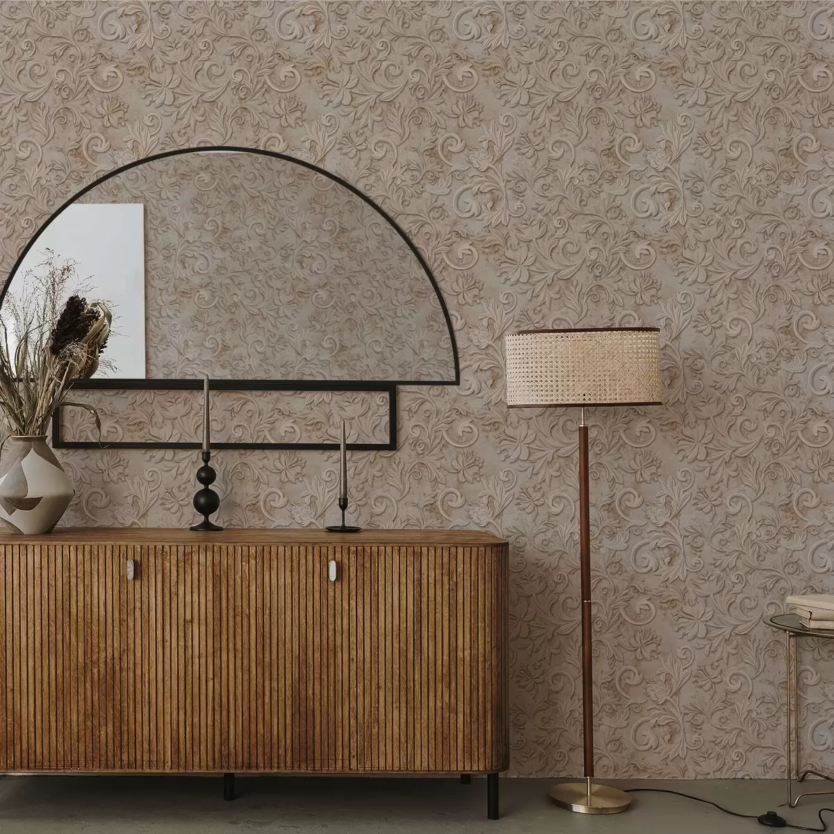 Tapeta Kamienna płaskorzeźba z kwiatowymi ornamentami, vintage beż a00784