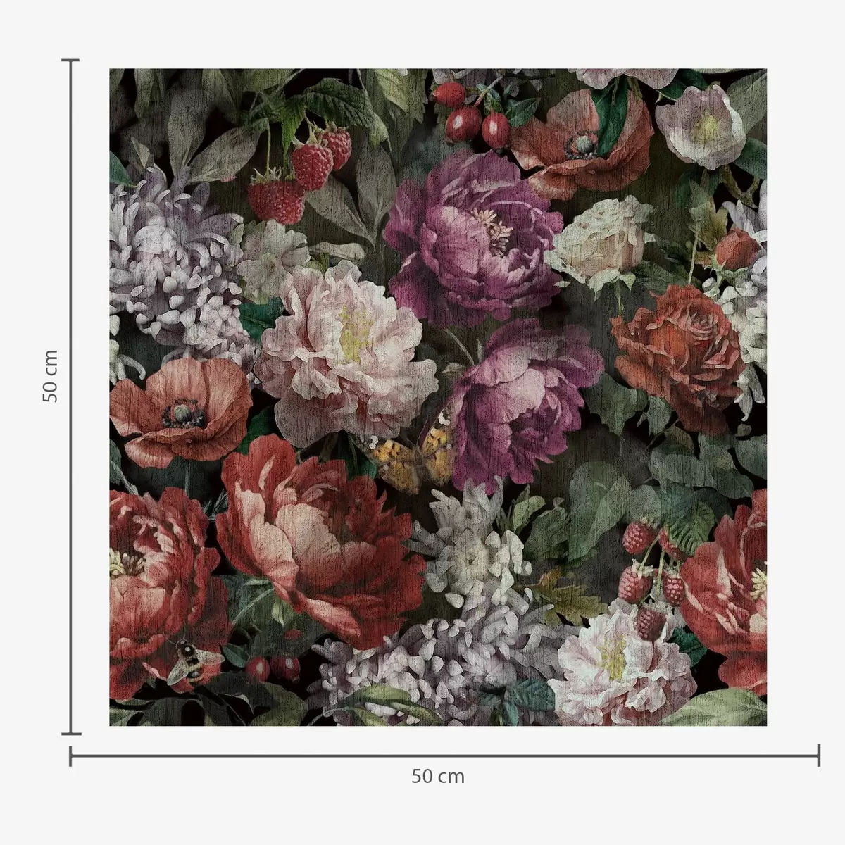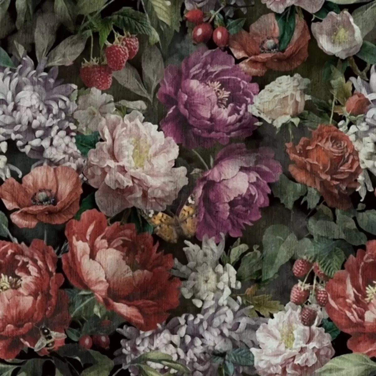 Fototapeta Ciemne, dramatyczne piwonie, jagody i motyl na czarnym tle Nr a00862