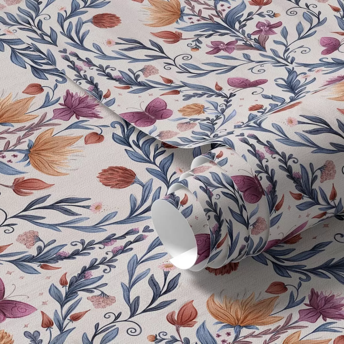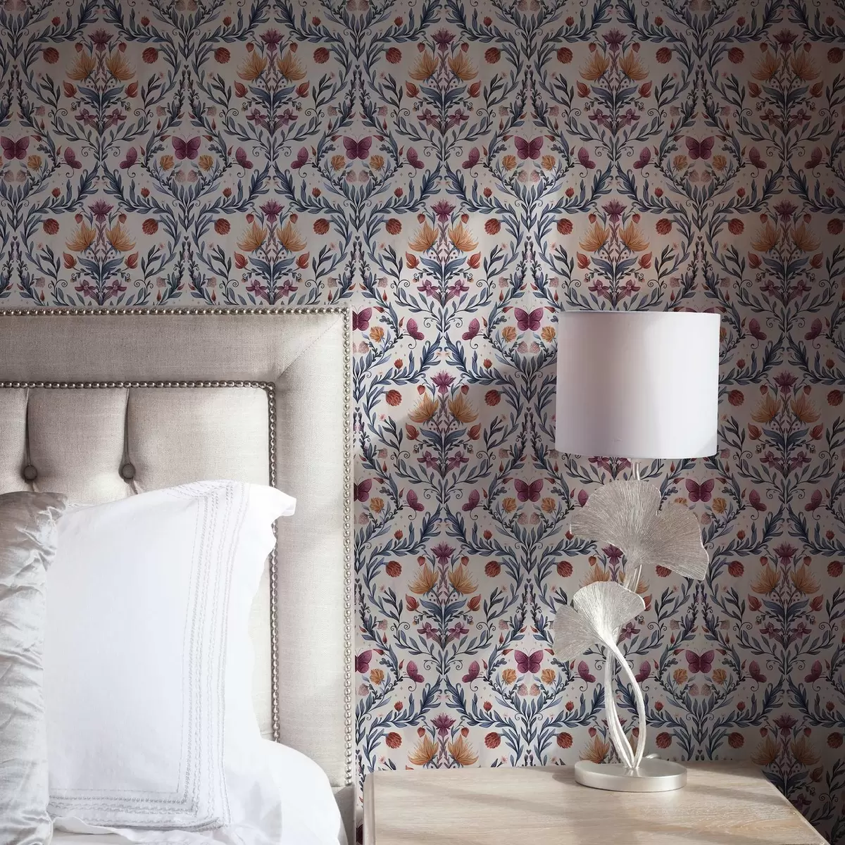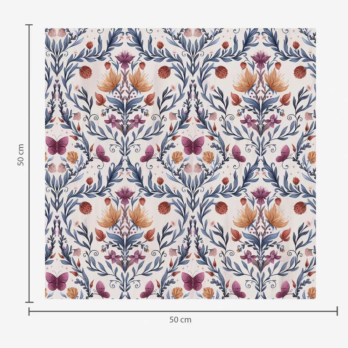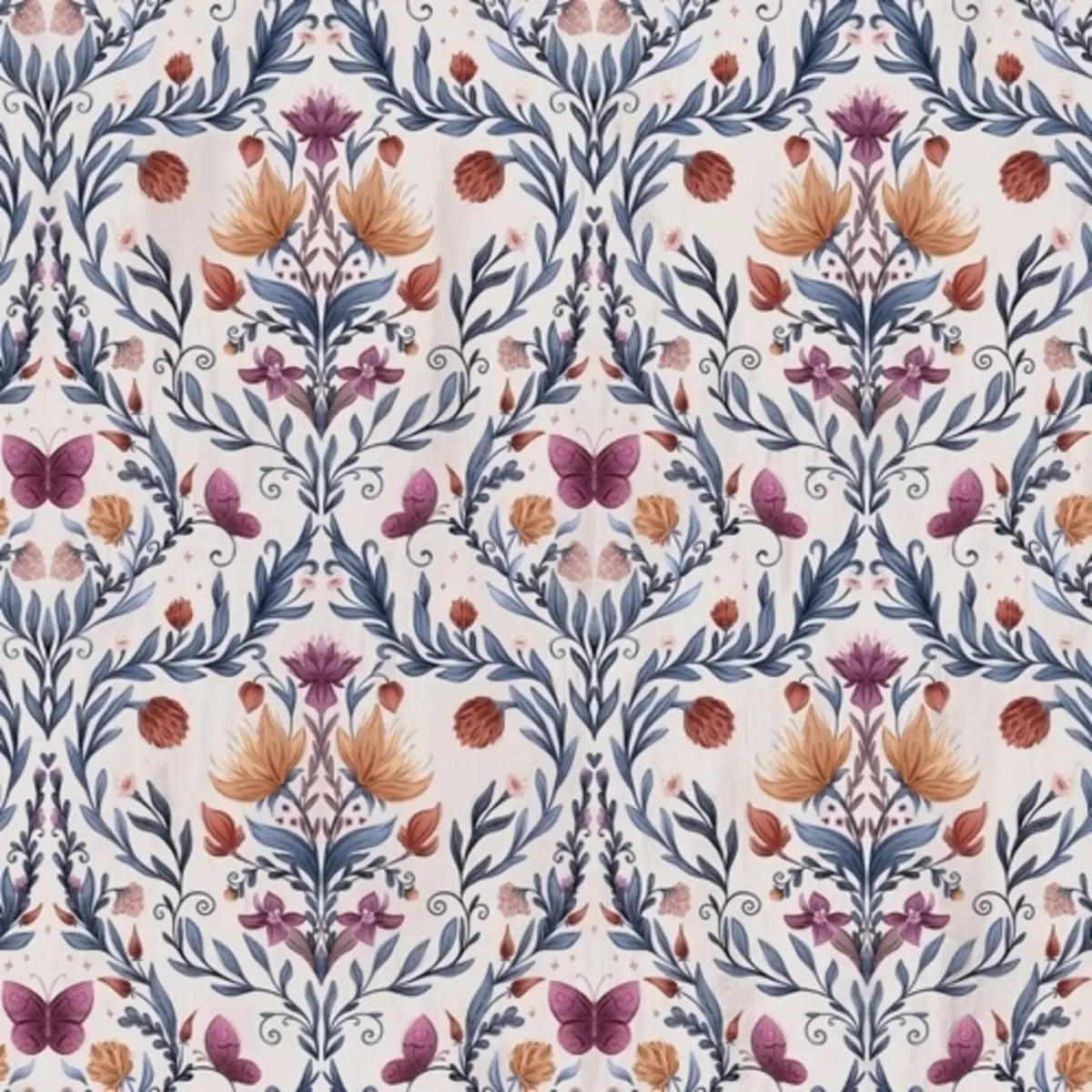 Fototapeta Kwiatowy wzór adamaszku z motylami w kolorze granatowym i terakotowym na białym tle Nr a00926v1