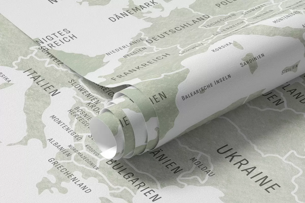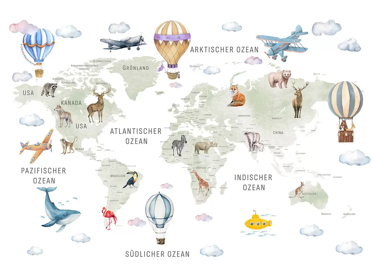 Fototapeta Mapa dla dzieci w stylu akwareli z motywami zwierząt i balonów na ogrzane powietrze. Język niemiecki. Kolor zielony. Nr c00001de