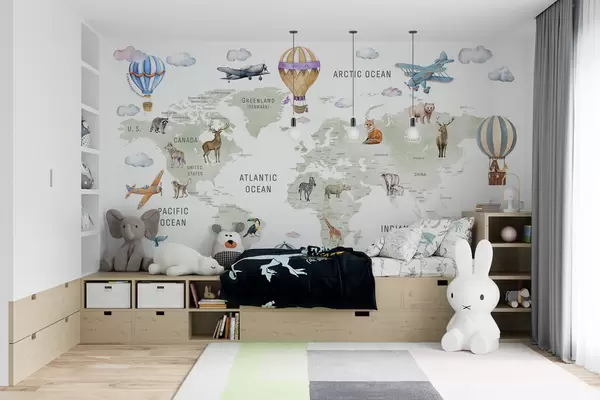 Fototapeta Mapa dla dzieci w stylu akwareli z motywem zwierząt i balonów na ogrzane powietrze. W języku angielskim. Kolor zielony. Nr c00001en