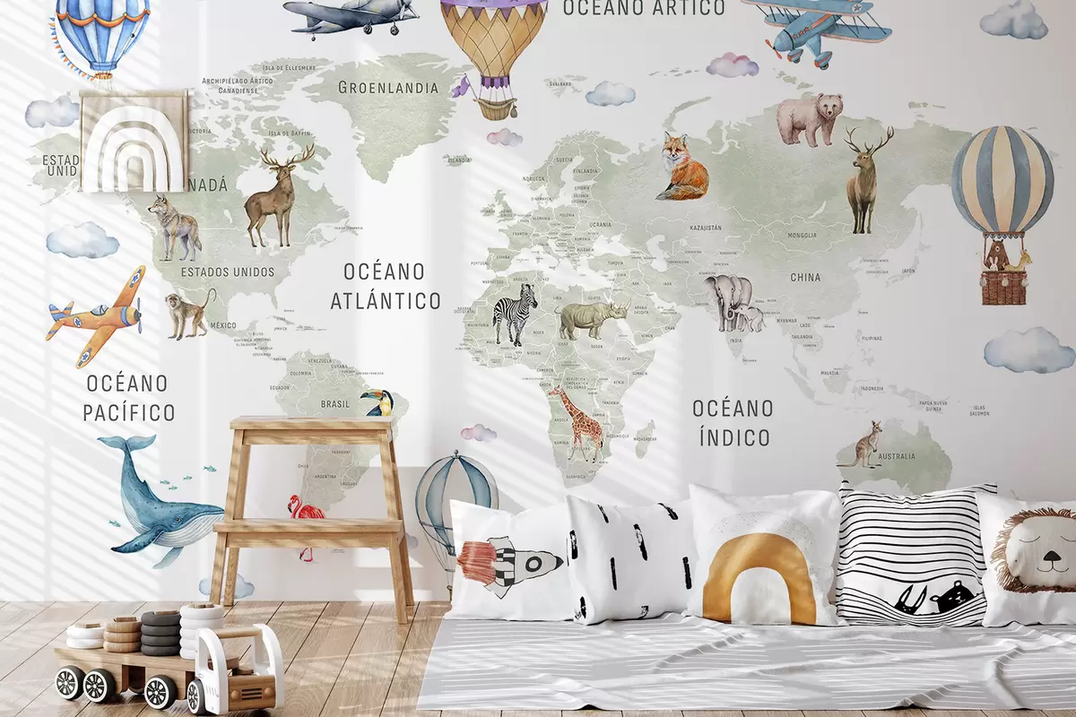 Fototapeta Mapa dla dzieci w stylu akwareli z motywami zwierząt i balonów na ogrzane powietrze. Język hiszpański. Kolor zielony. Nr c00001es