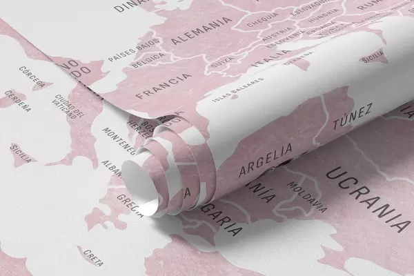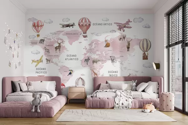 Fototapeta Mapa dla dzieci w stylu akwareli z motywami zwierząt i balonów na ogrzane powietrze. Język hiszpański. Kolor różowy. Nr c00001esv3