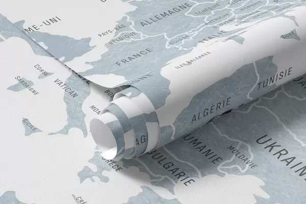Fototapeta Mapa dla dzieci w stylu akwareli z motywami zwierząt i balonów na ogrzane powietrze. Język francuski. Kolor niebieski. Nr c00001frv1