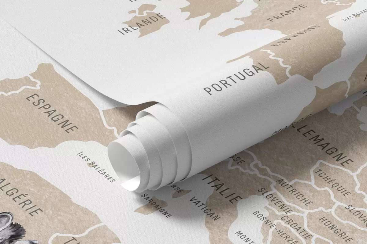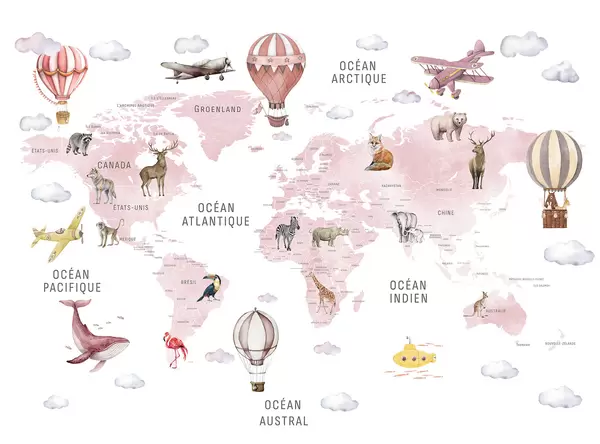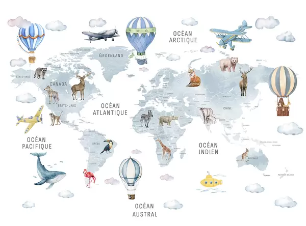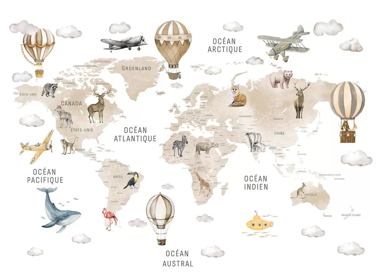 Fototapeta Mapa dla dzieci w stylu akwareli z motywami zwierząt i balonów na ogrzane powietrze. Język francuski. Kolor beżowy. Nr c00001frv2