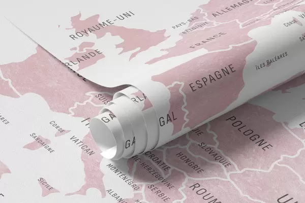 Fototapeta Mapa dla dzieci w stylu akwareli z motywami zwierząt i balonów na ogrzane powietrze. Język francuski. Kolor różowy. Nr c00001frv3
