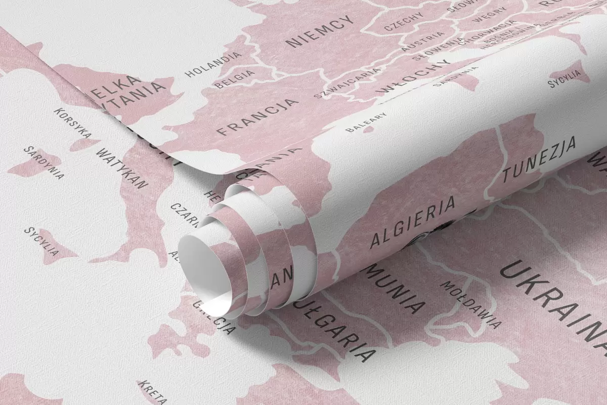 Fototapeta Mapa dla dzieci w stylu akwareli z motywem zwierząt i balonów na ogrzane powietrze. W języku polskim. Kolor różowy. Nr c00001plv3