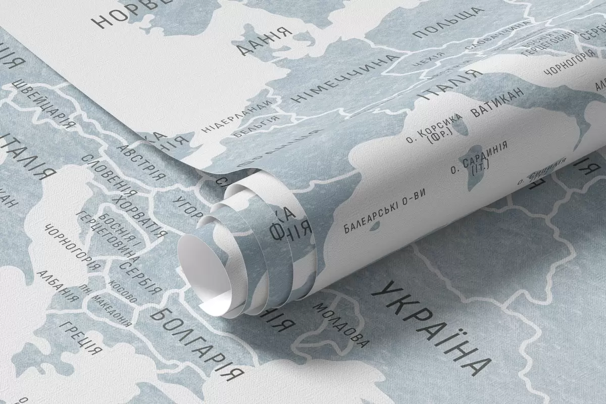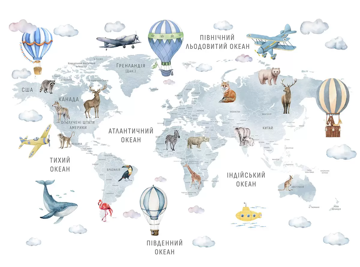 Fototapeta Mapa dla dzieci w stylu akwareli z motywami zwierząt i balonów na ogrzane powietrze. Język ukraiński. Kolor niebieski. Nr c00001ukv1