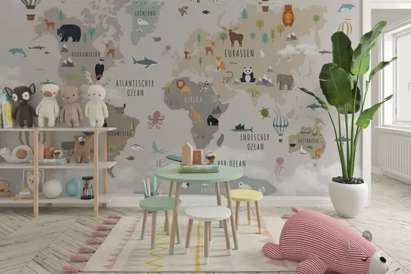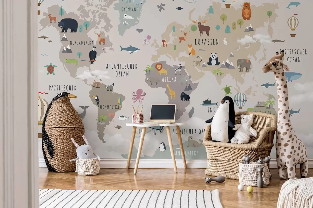 Fototapeta Mapa świata dla dzieci z zwierzętami i balonami na ogrzane powietrze. Język niemiecki Nr c00002de