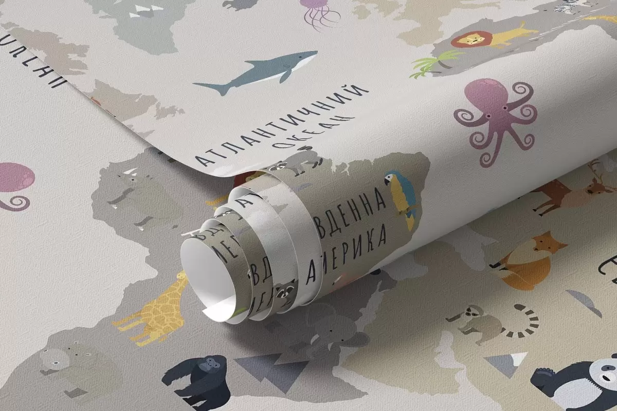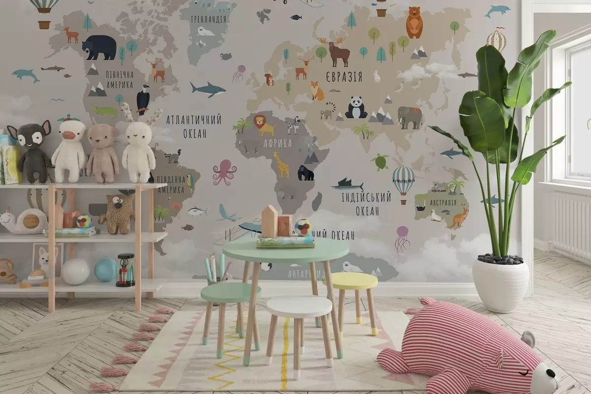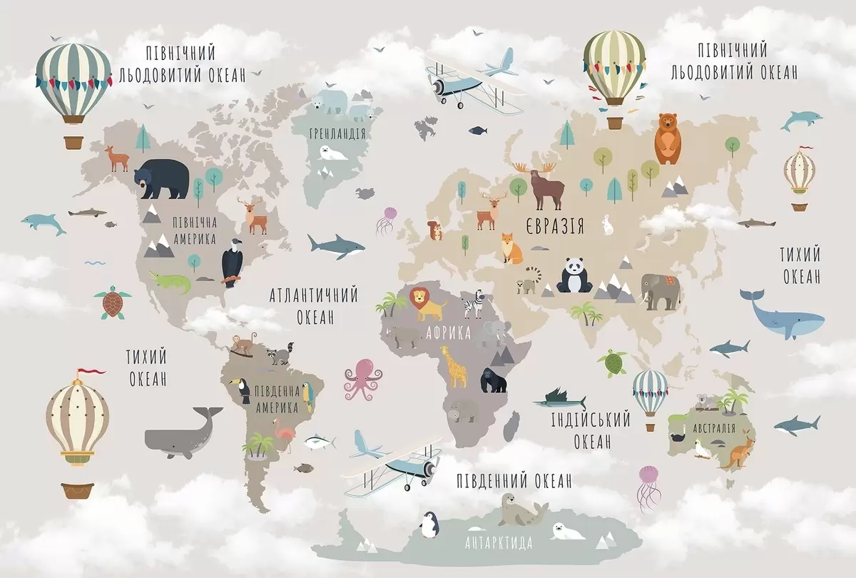 Fototapeta Mapa świata dla dzieci z zwierzętami i balonami na ogrzane powietrze. Język ukraiński Nr c00002uk