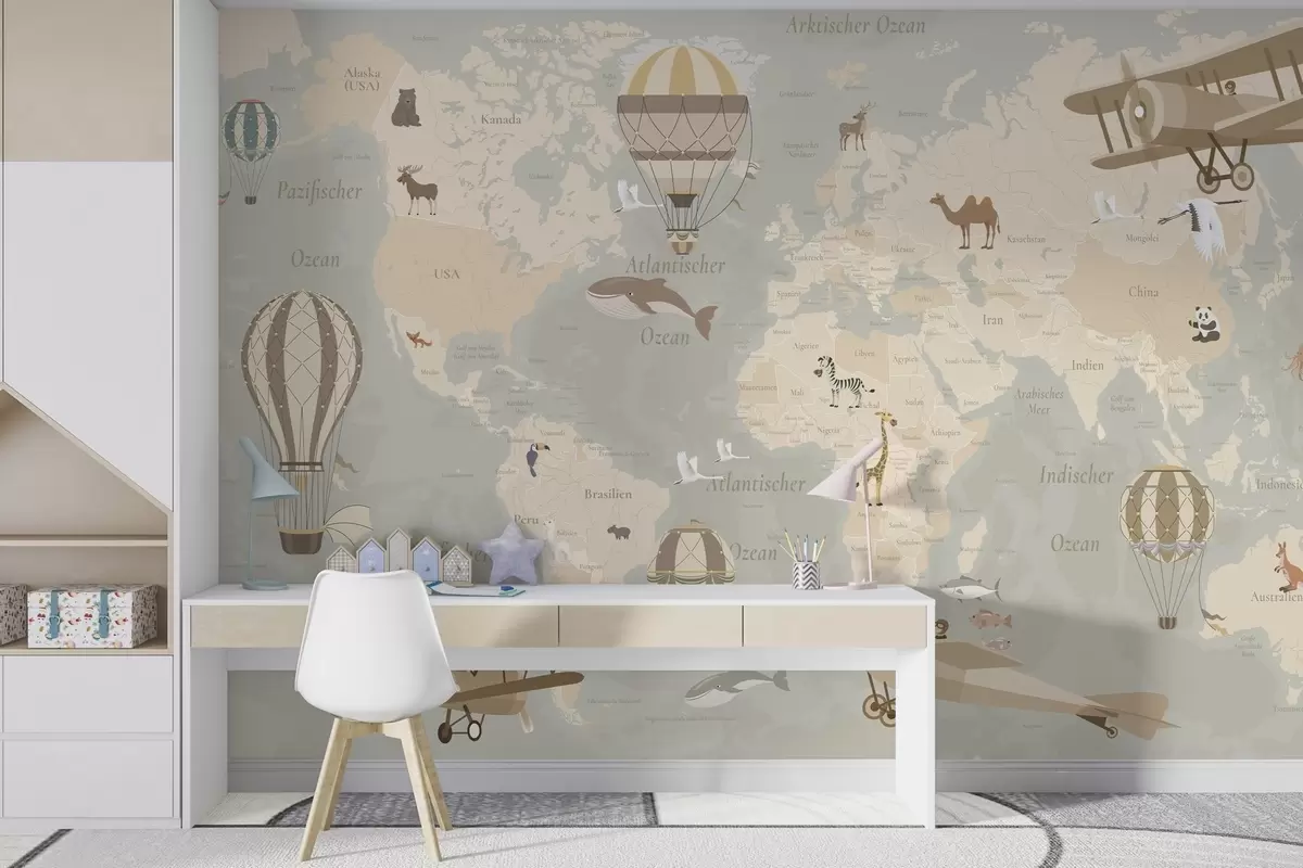 Fototapeta Mapa świata dla dzieci z zwierzętami, samolotami i balonami na ogrzane powietrze. Język niemiecki. Kolor beżowy. Nr c00003de