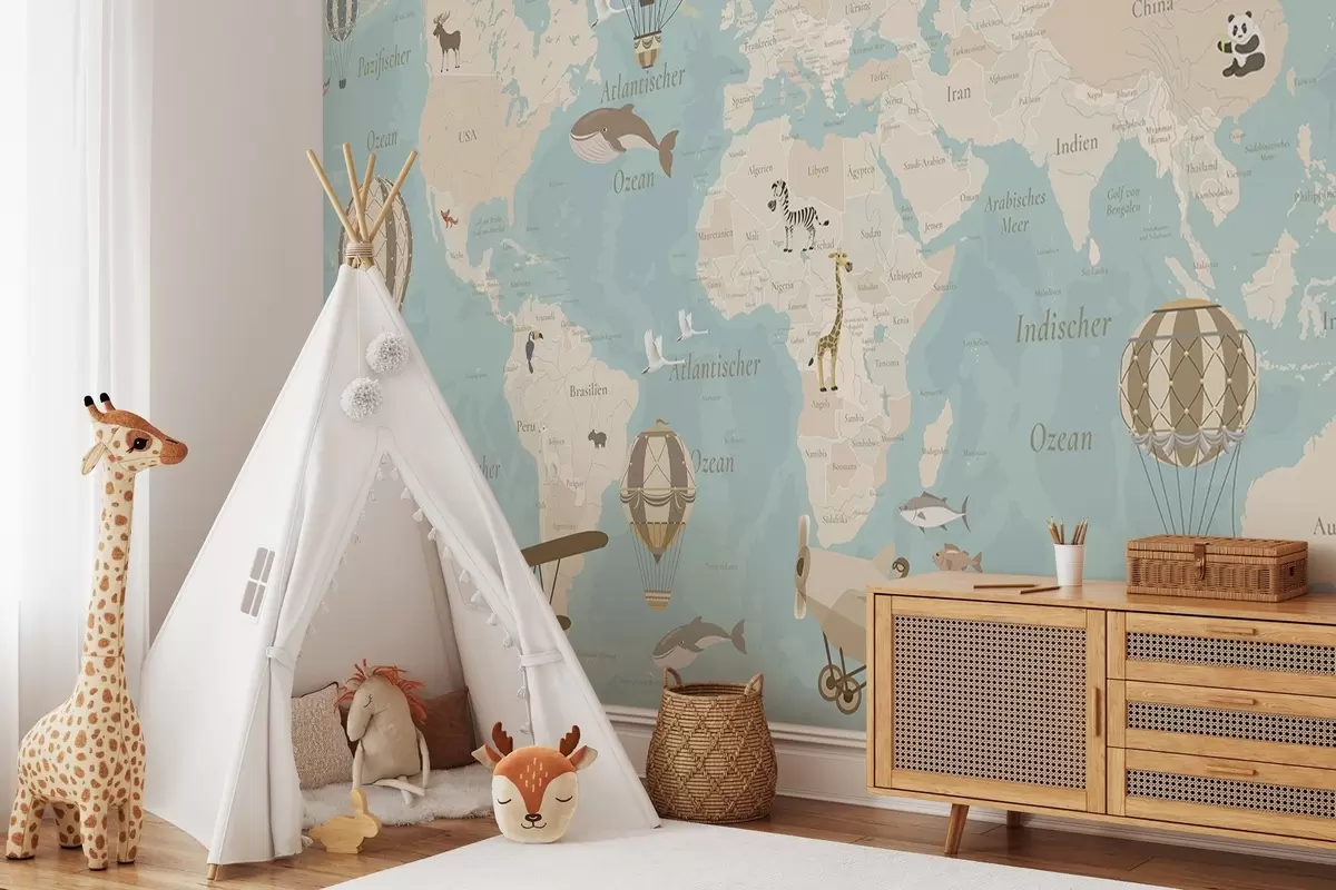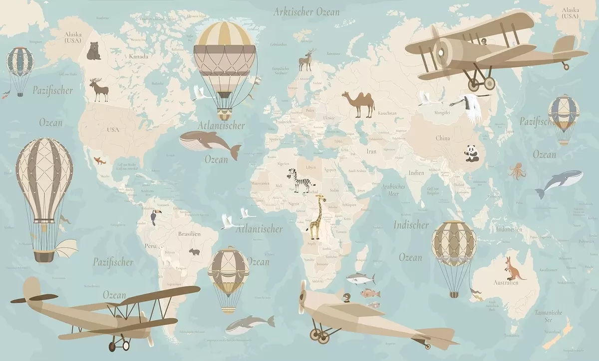 Fototapeta Mapa świata dla dzieci z zwierzętami, samolotami i balonami na ogrzane powietrze. Język niemiecki. Kolor niebieski. Nr c00003dev1