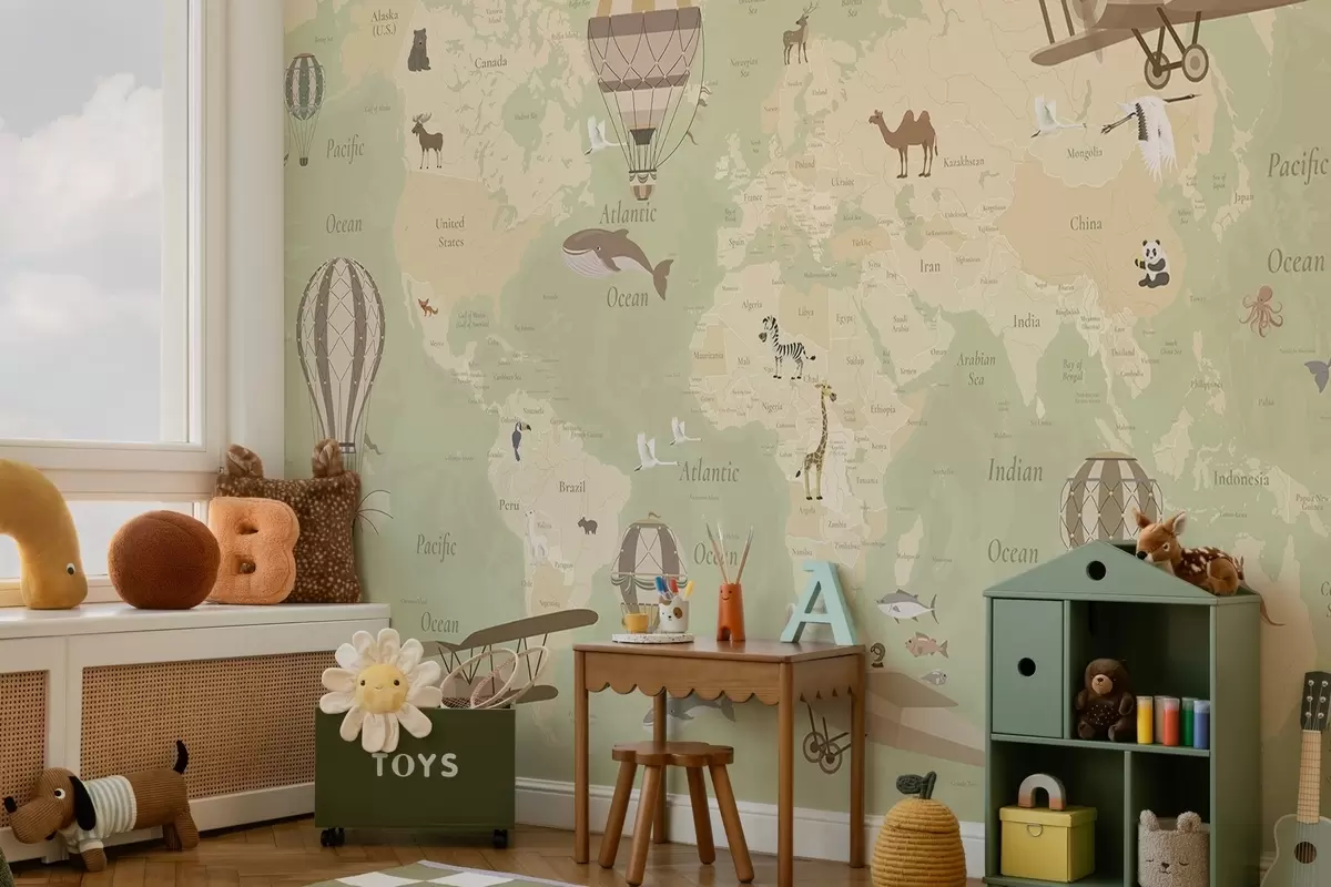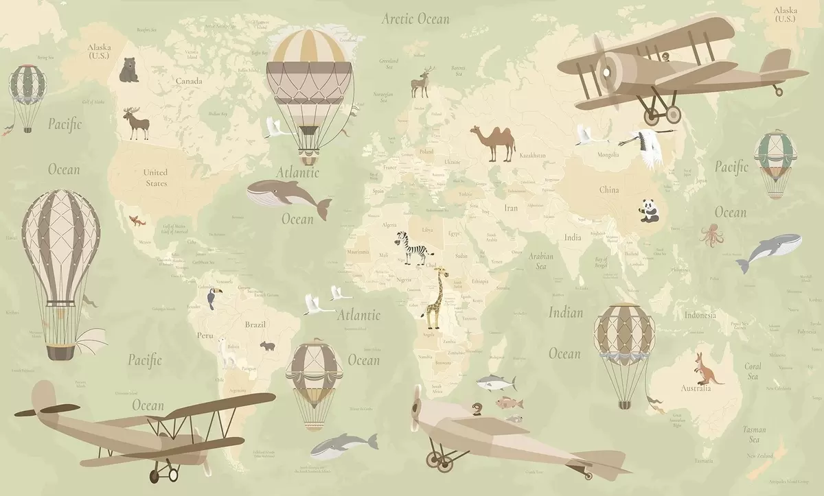 Fototapeta Mapa świata dla dzieci z zwierzętami, samolotami i balonami na ogrzane powietrze. Język angielski. Kolor zielony. Nr c00003env2