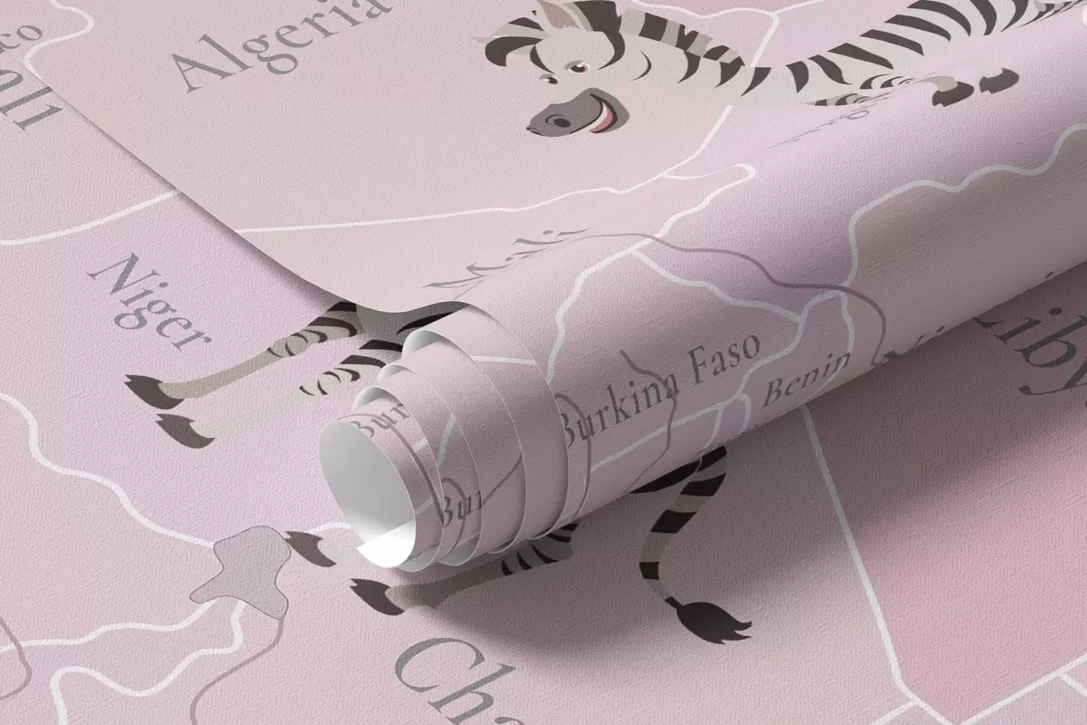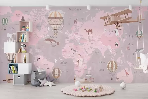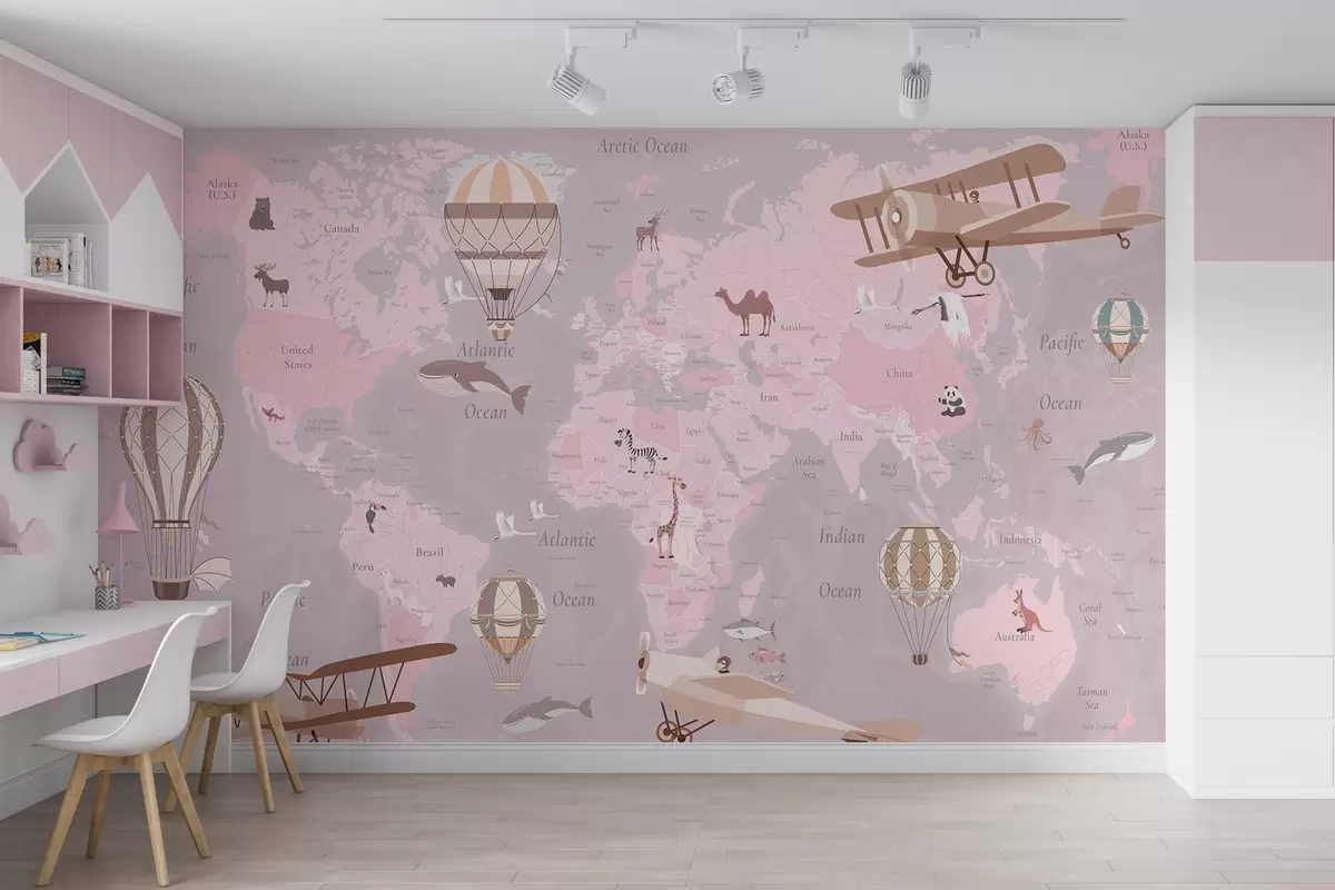 Fototapeta Mapa świata dla dzieci z zwierzętami, samolotami i balonami na ogrzane powietrze. Język angielski. Kolor różowy. Nr c00003env3