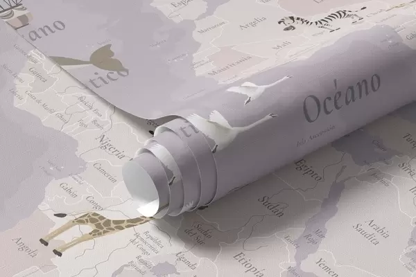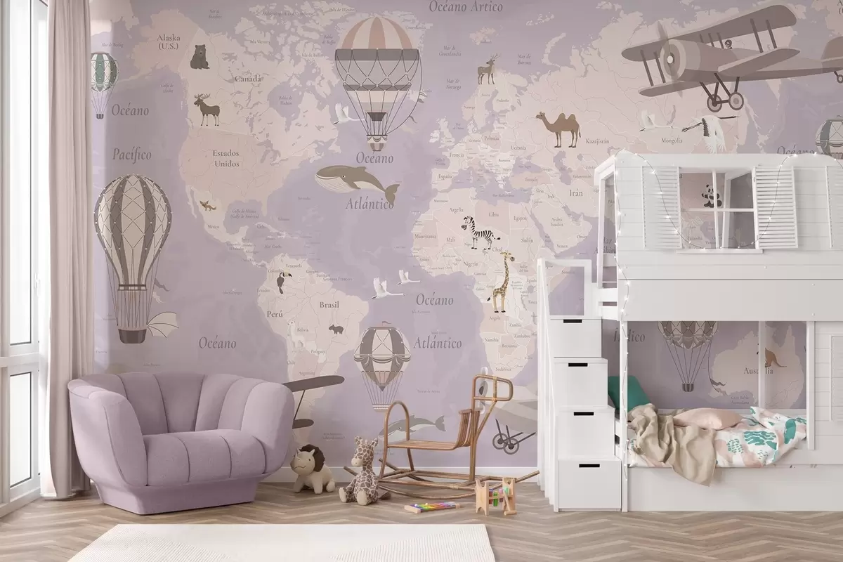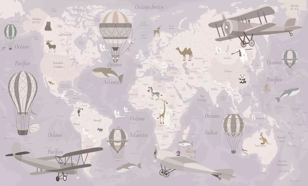 Fototapeta Mapa świata dla dzieci z zwierzętami, samolotami i balonami na ogrzane powietrze. Język hiszpański. Kolor fioletowy. Nr c00003esv4