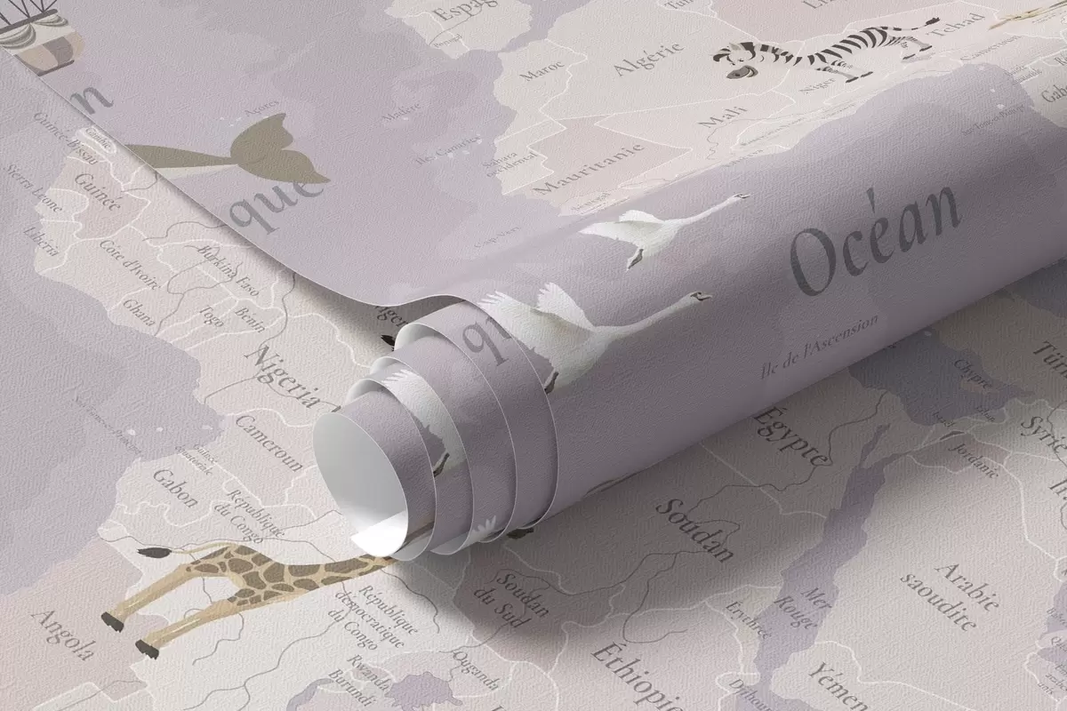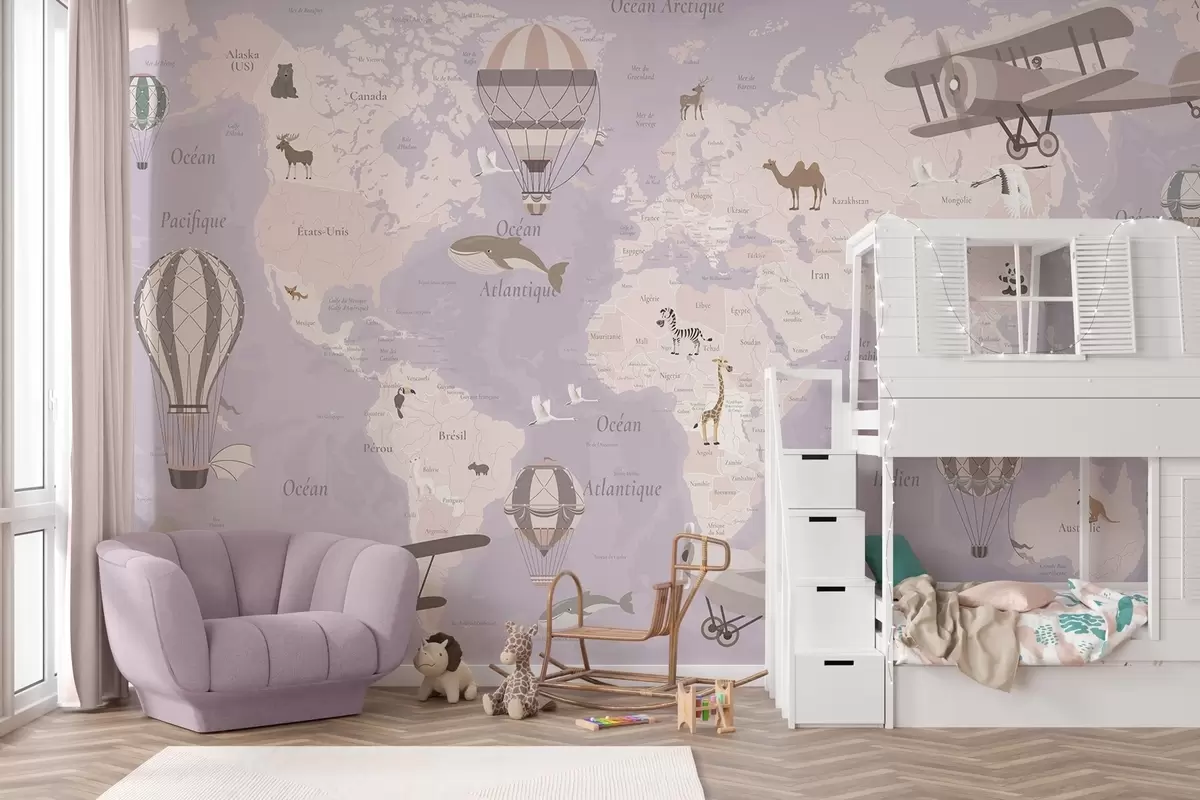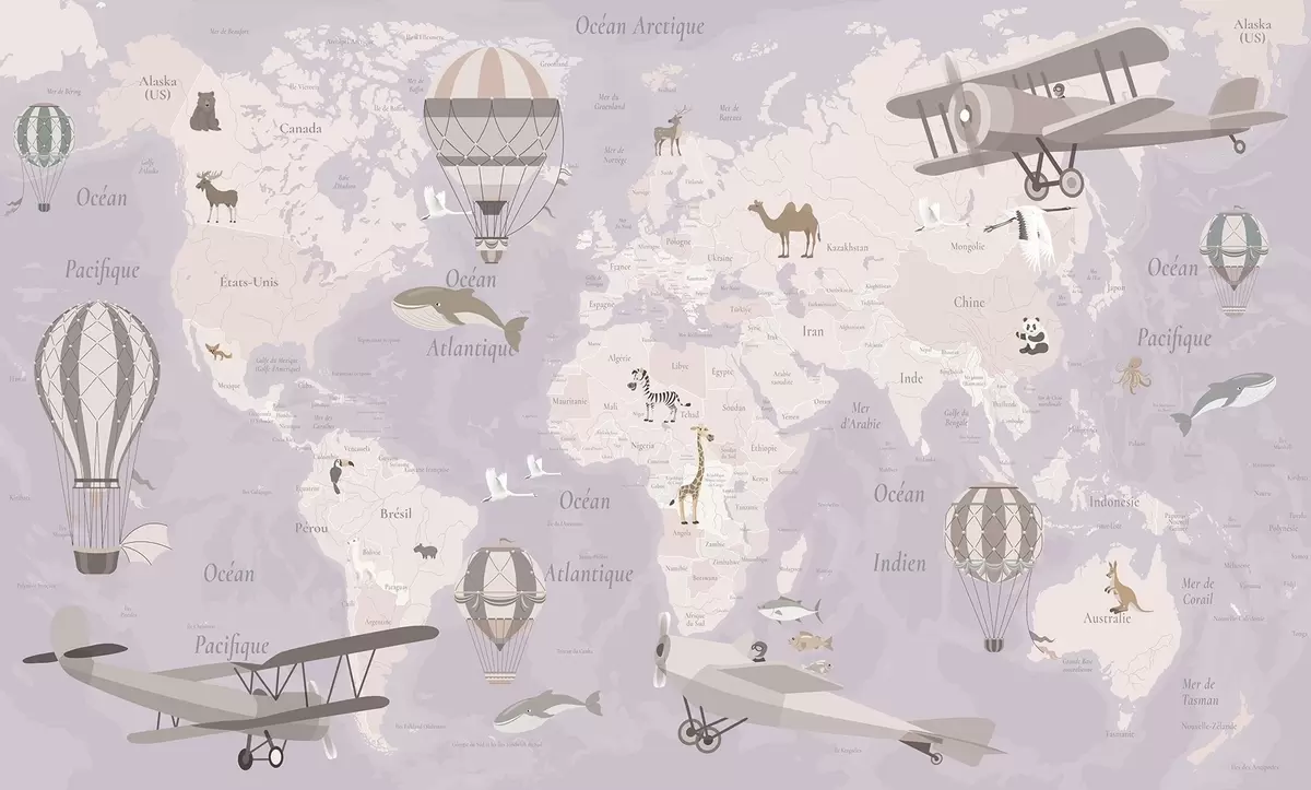 Fototapeta Mapa świata dla dzieci z zwierzętami, samolotami i balonami na ogrzane powietrze. Język francuski. Kolor fioletowy. Nr c00003frv4