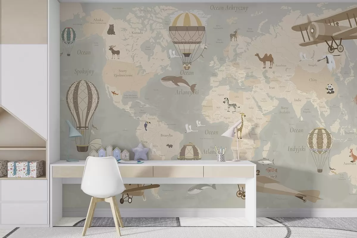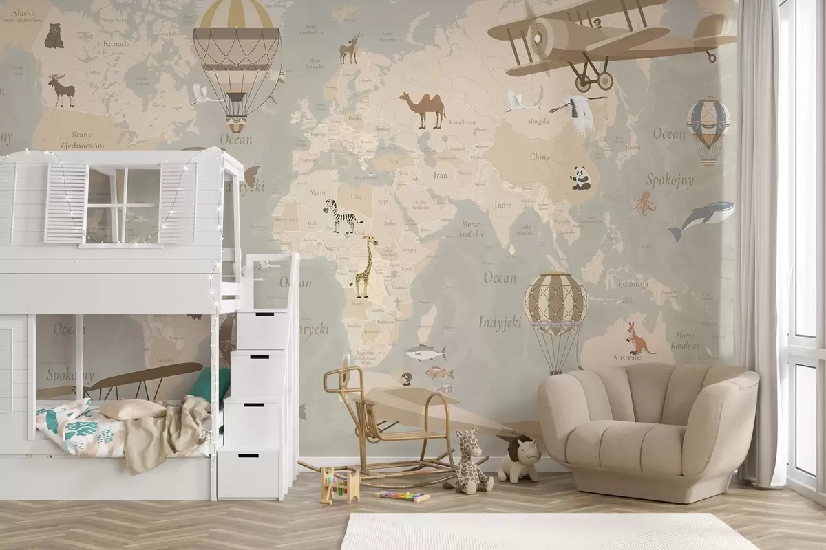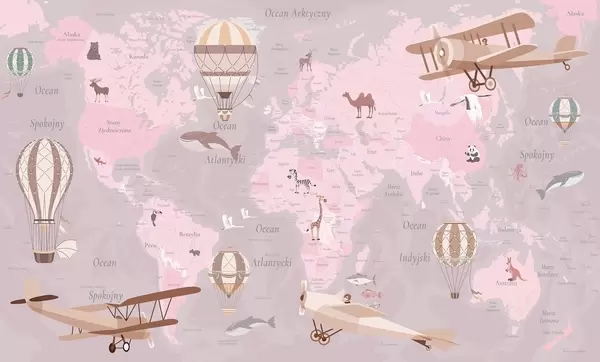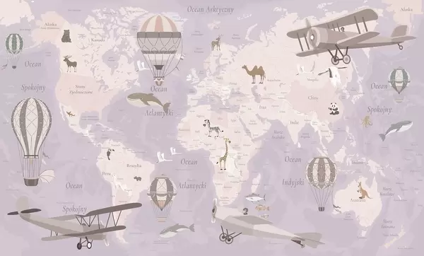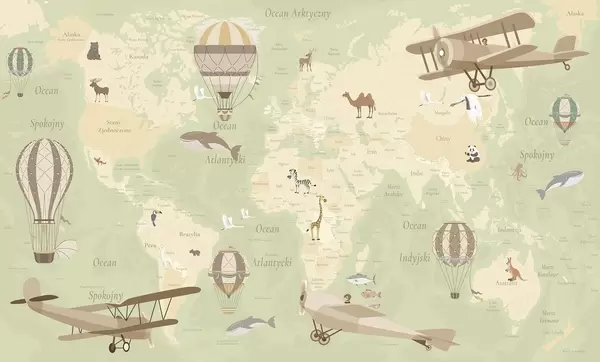 Fototapeta Mapa świata dla dzieci z zwierzętami, samolotami i balonami na ogrzane powietrze. Język polski. Kolor beżowy. Nr c00003pl
