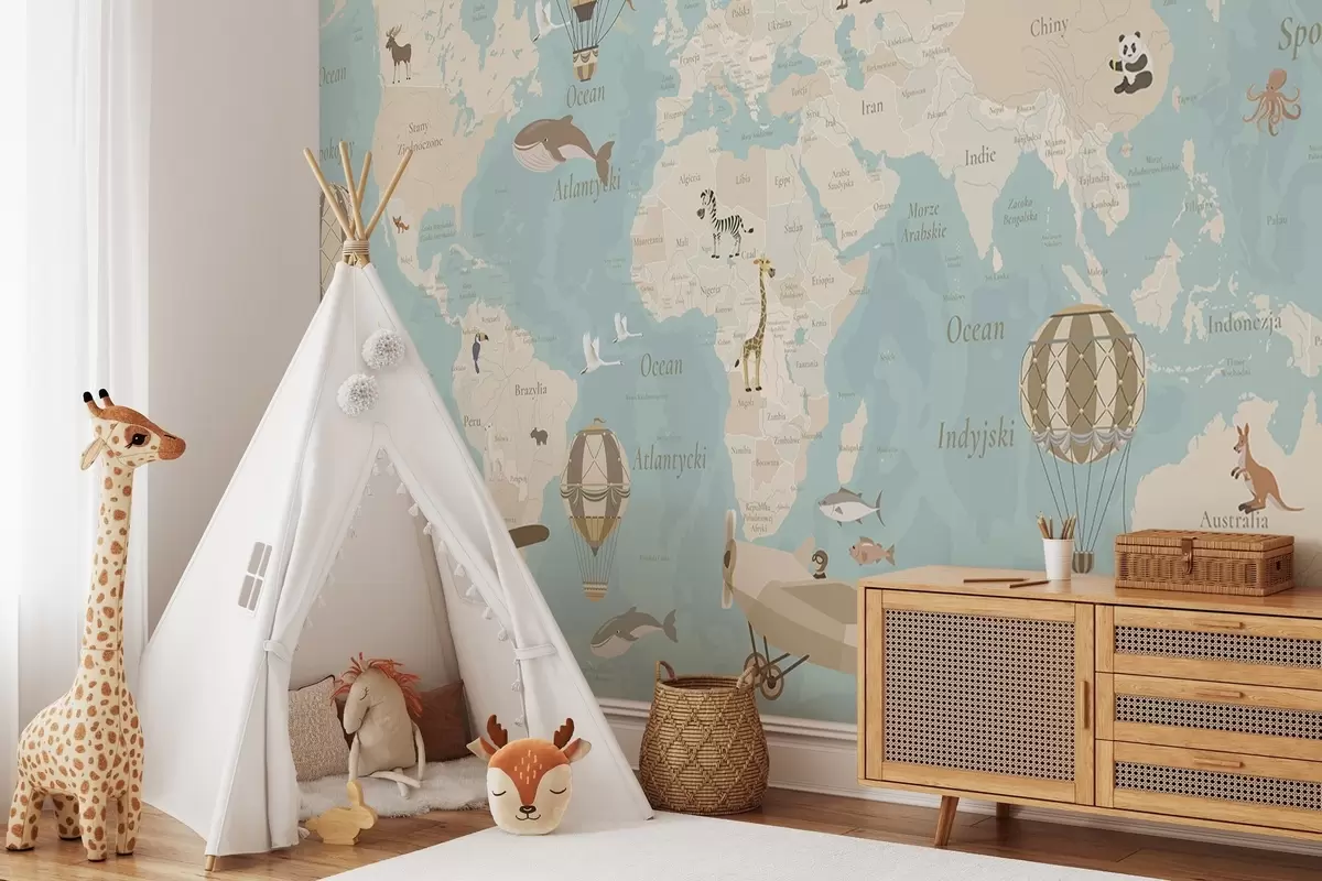 Fototapeta Mapa świata dla dzieci z zwierzętami, samolotami i balonami na ogrzane powietrze. Język polski. Kolor niebieski. Nr c00003plv1