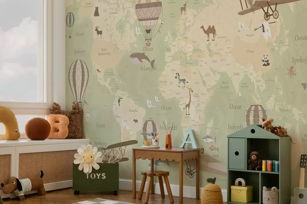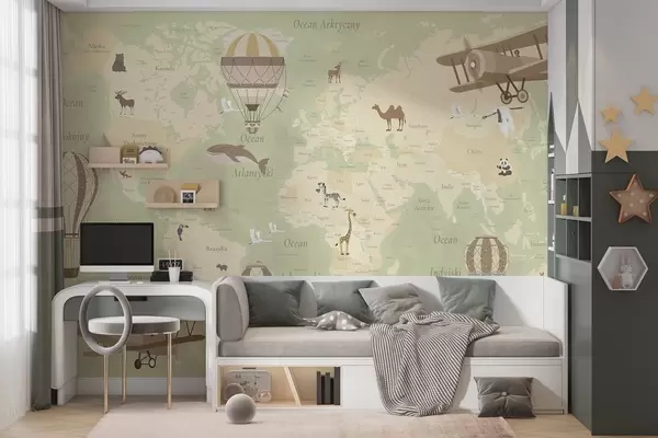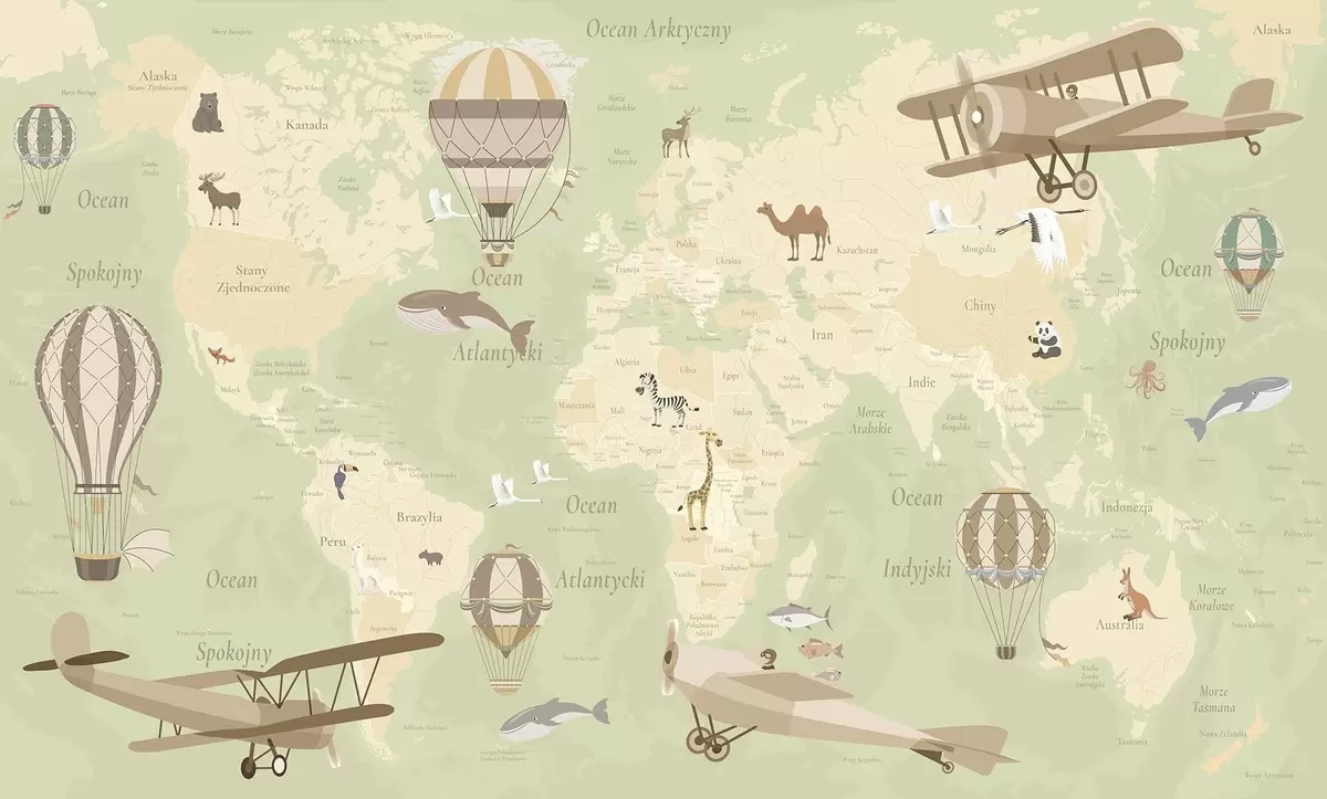 Fototapeta Mapa świata dla dzieci z zwierzętami, samolotami i balonami na ogrzane powietrze. Język polski. Kolor zielony. Nr c00003plv2
