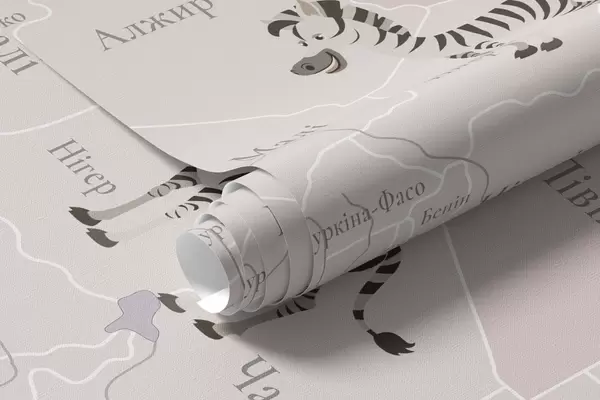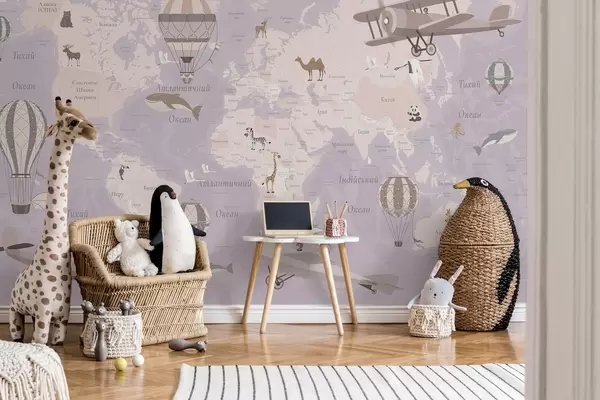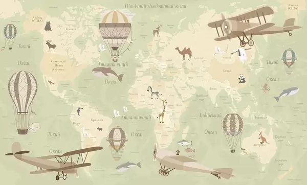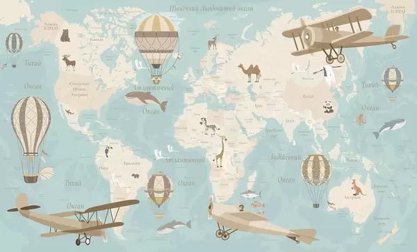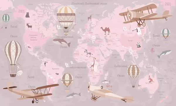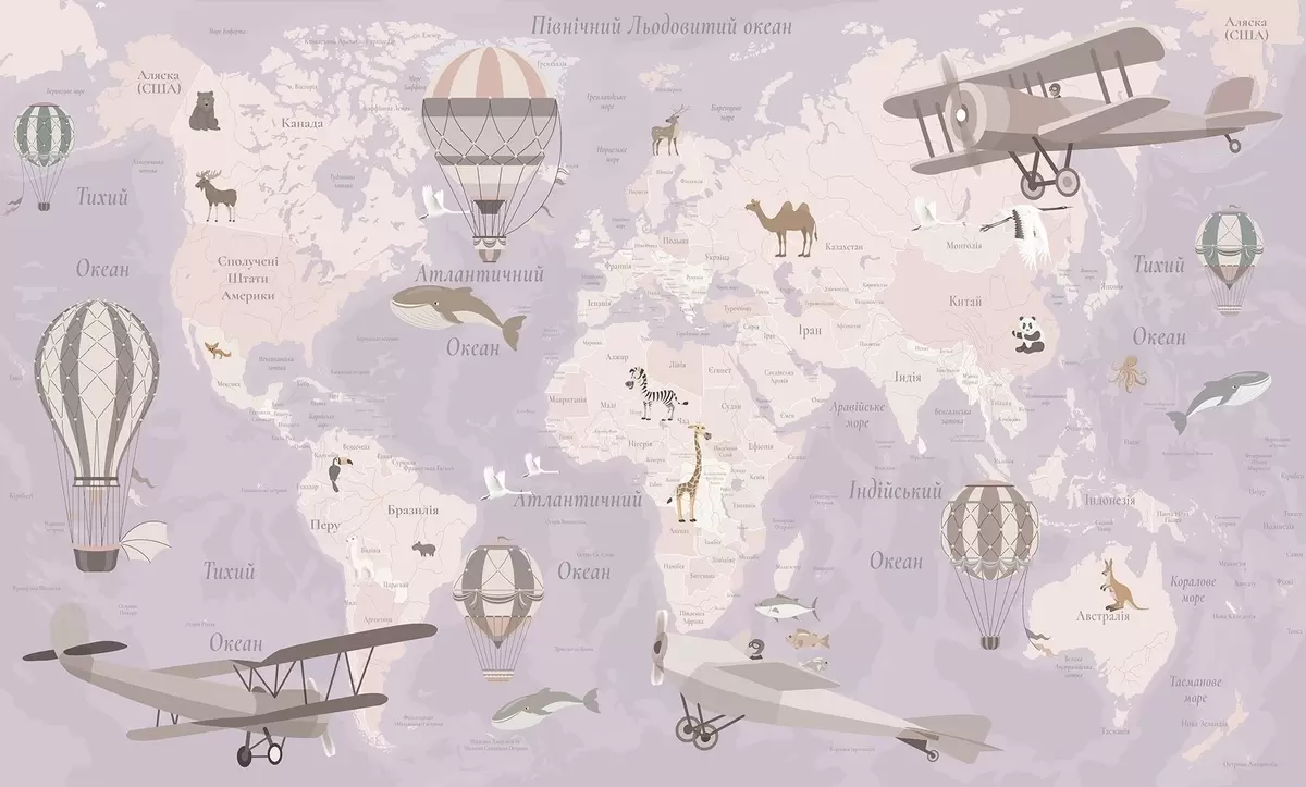 Fototapeta Mapa świata dla dzieci z zwierzętami, samolotami i balonami na ogrzane powietrze. Język ukraiński. Kolor fioletowy. Nr c00003ukv4