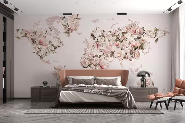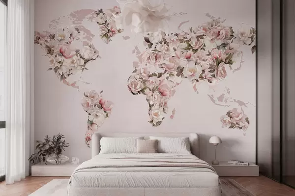 Fototapeta Różowa mapa świata ułożona z dużych białych i różowych piwonii Nr c00005