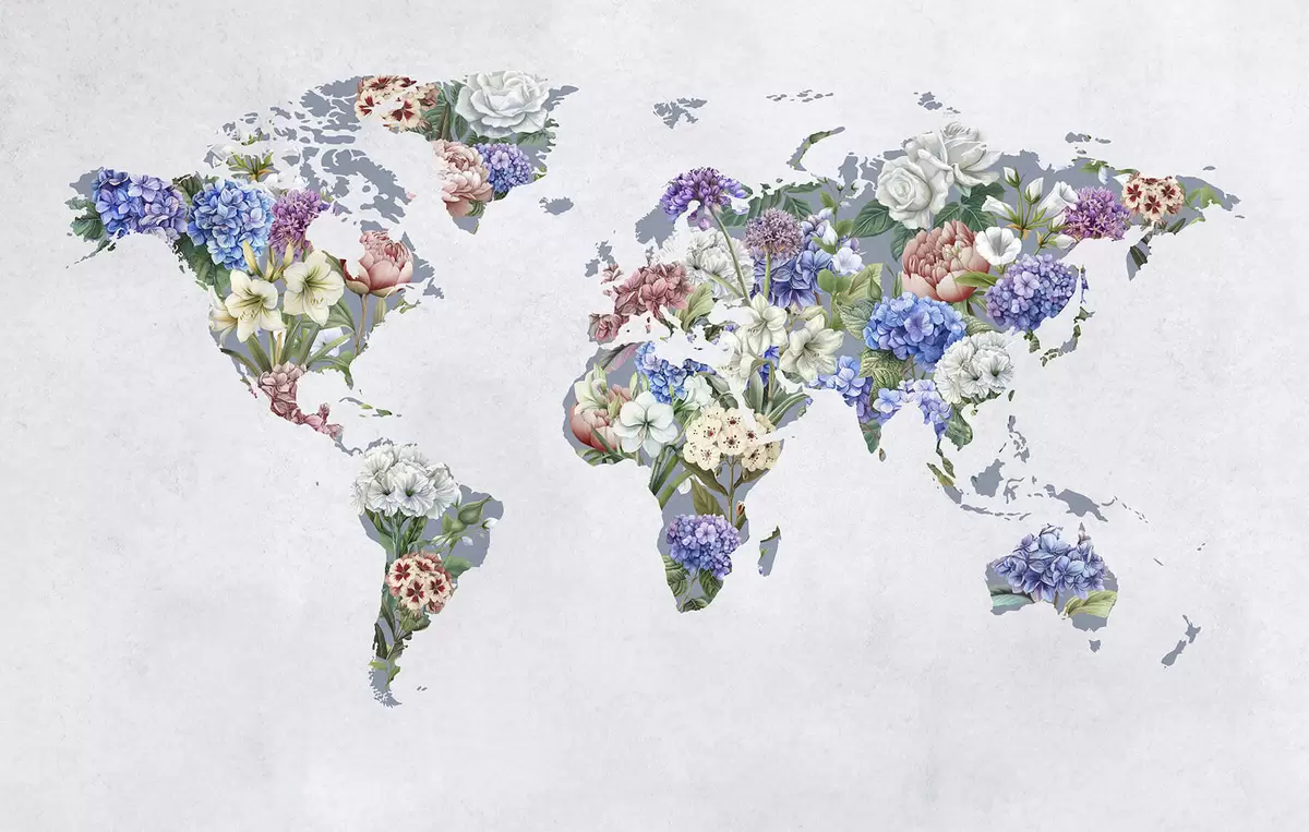 Fototapeta Kolorowa mapa świata wykonana z różnorodnych, żywych kwiatów Nr c00006