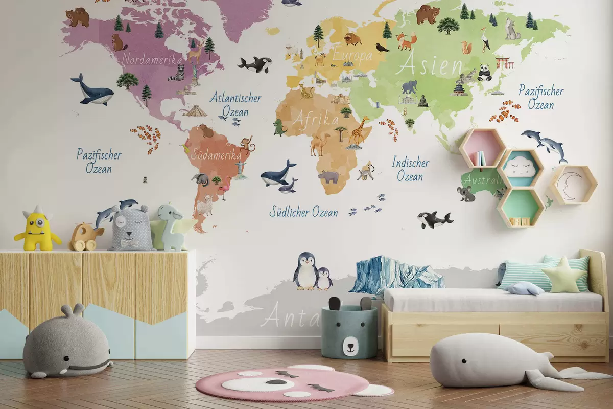 Fototapeta Mapa w stylu akwareli przedstawiająca zwierzęta, rośliny i zabytki architektury. Napisy w języku niemieckim Nr c00009de