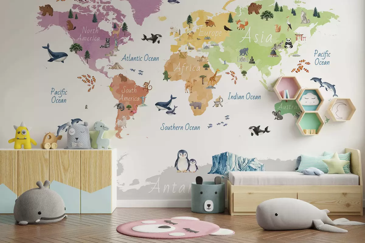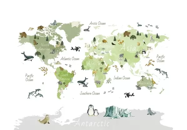 Fototapeta Mapa w stylu akwareli przedstawiająca zwierzęta, rośliny i zabytki architektury. Opisy w języku angielskim Nr c00009en
