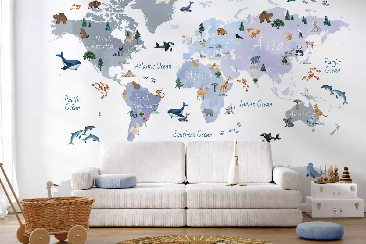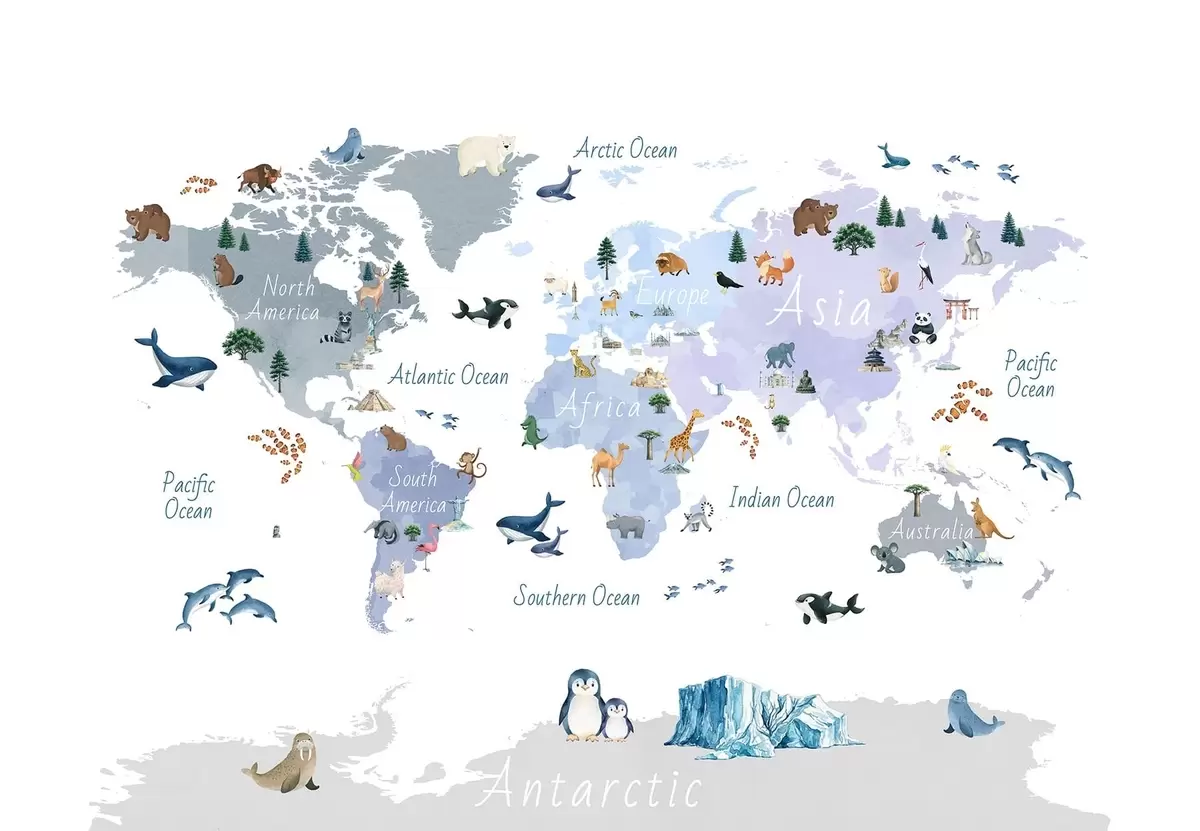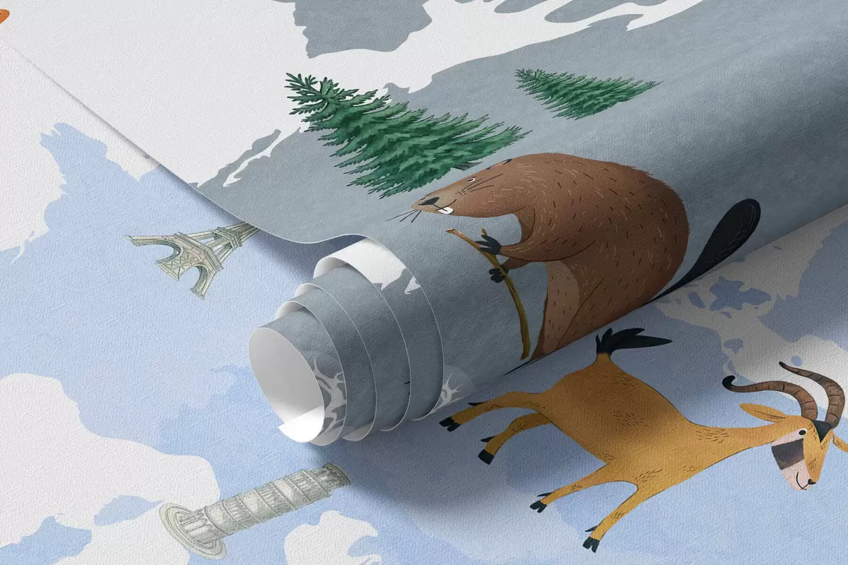 Fototapeta Niebieska mapa w stylu akwareli, przedstawiająca zwierzęta, rośliny i zabytki architektury. Napisy w języku angielskim Nr c00009env1